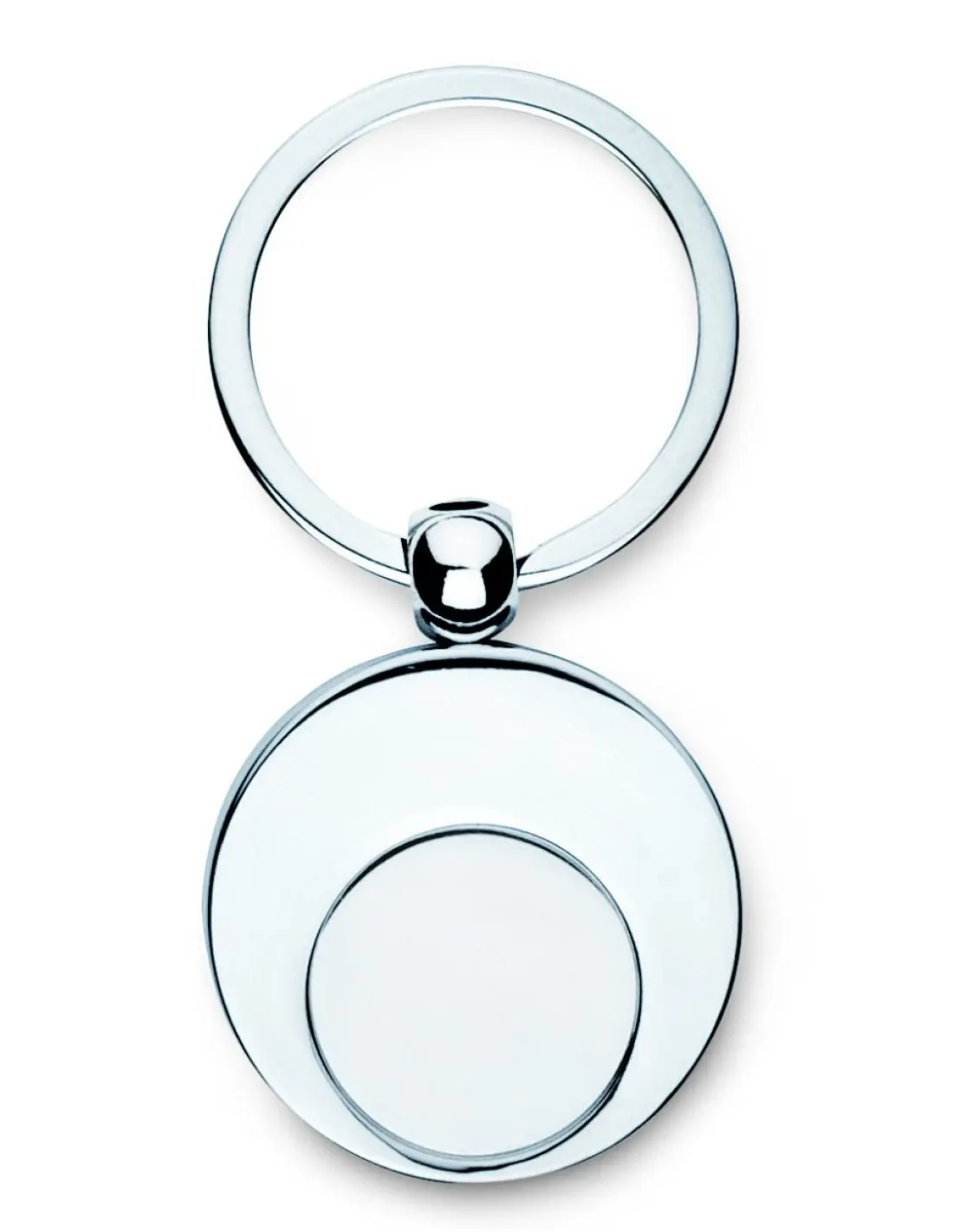 Llavero redondo de metal con ficha para carro de la compra incluida.