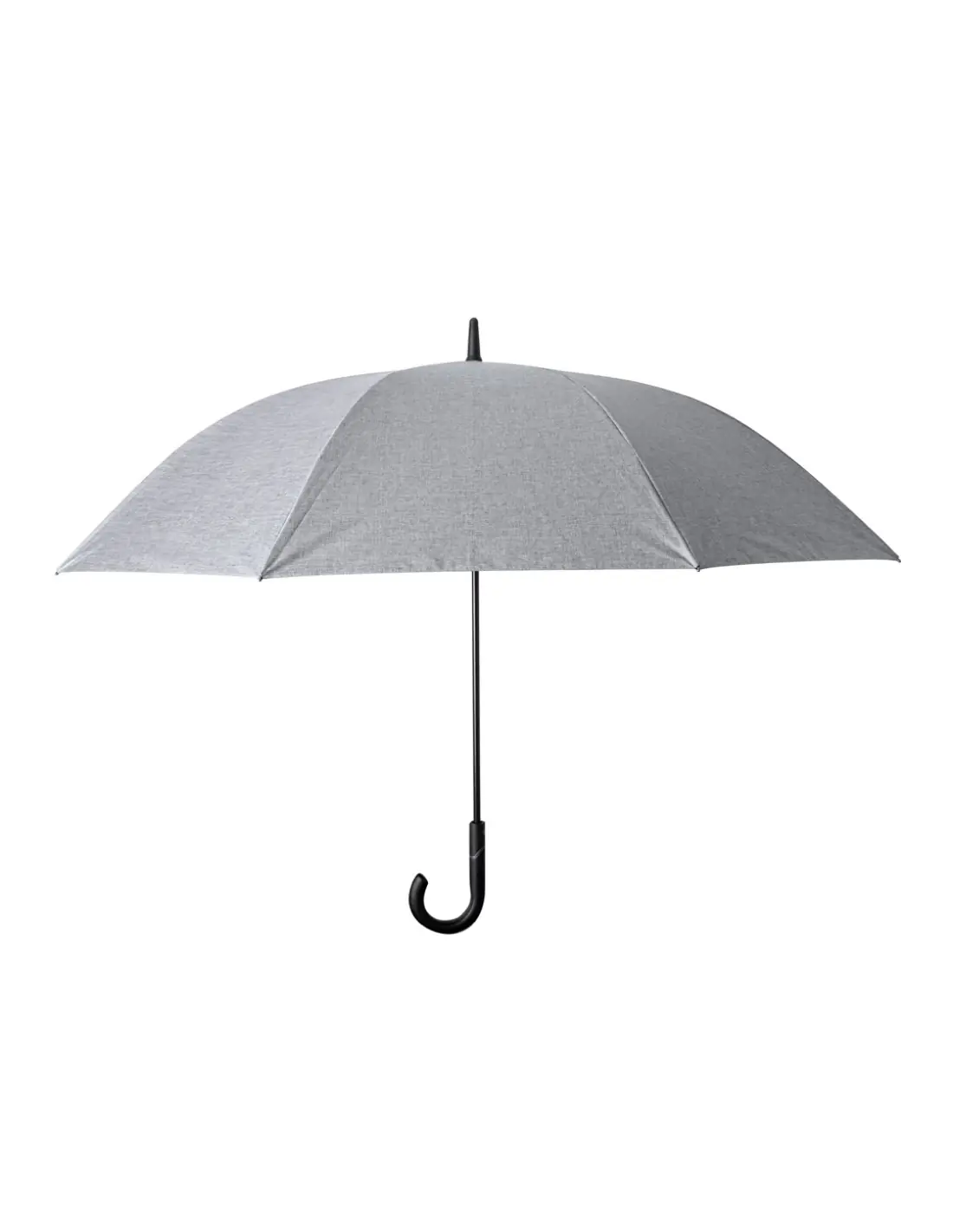 Paraguas de alta calidad y 130cm de diámetro, fabricado en material poliéster 150D y en elegante tono gris jaspeado. Apertura automática y varillas de fibra de vidrio, con sistema antiviento y cierre de velcro. Con mango ergonómico en suave ABS y presentado en bolsa reciclada.