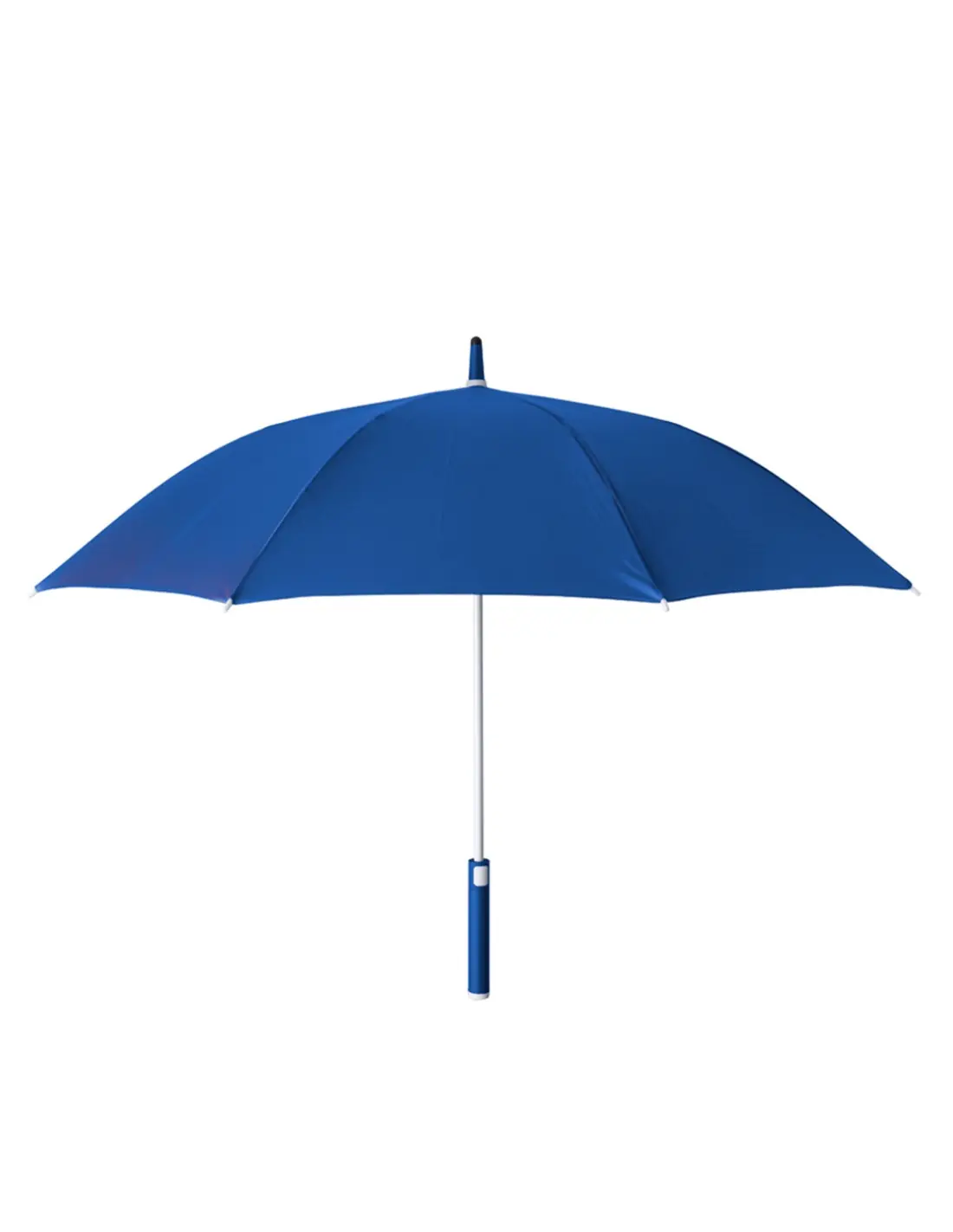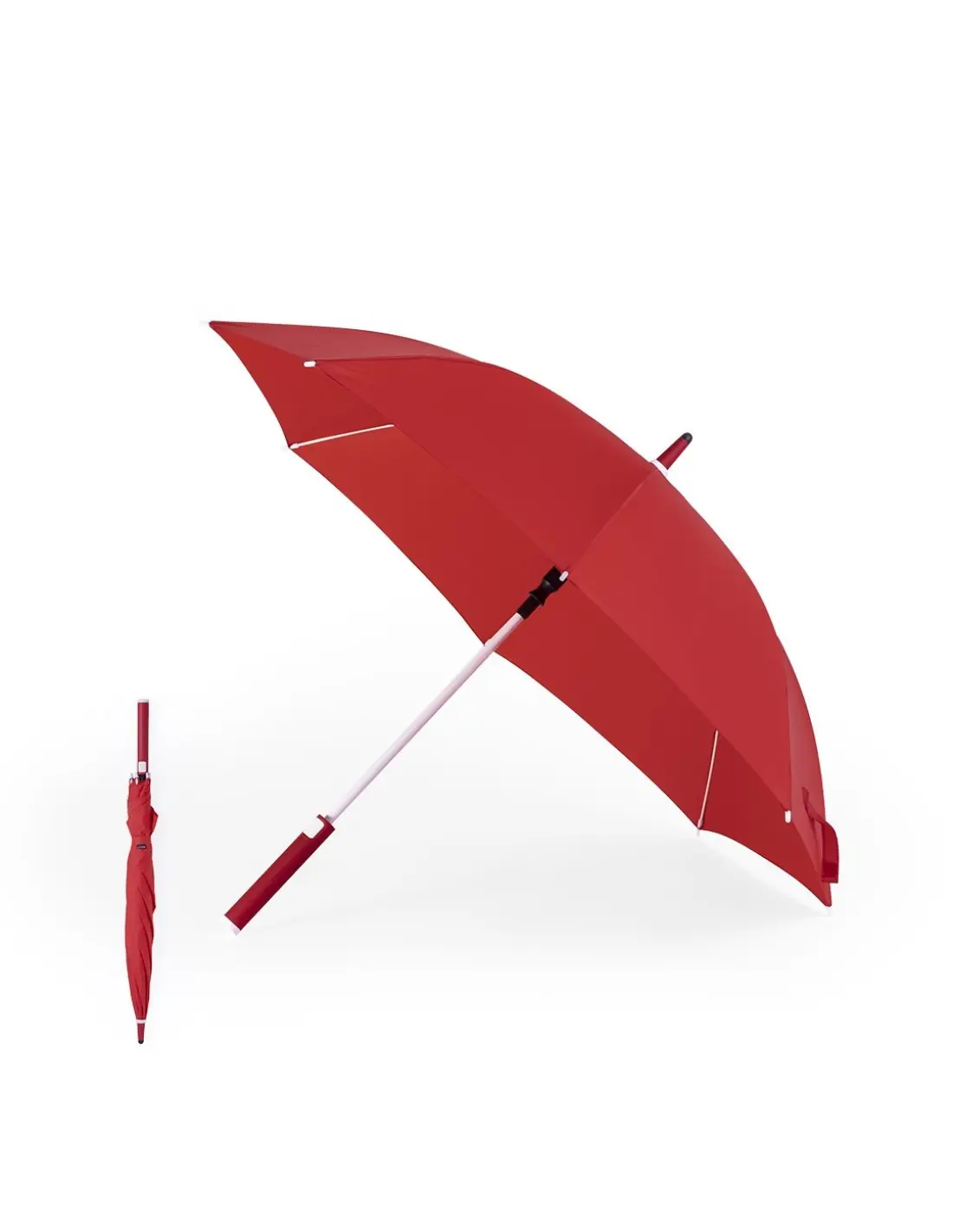 Paraguas de 105cm de diámetro en material poliéster 190T RPET. Apertura automática y varillas de fibra de vidrio antiviento, en variedad de alegres colores en cierre de velcro. Mango recto y caña en suave ABS de tacto gomoso, con etiqueta distintiva RPET.El material RPET se elabora a partir de plástico reciclado, para así fomentar la reutilización de residuos plásticos y ayudar a la sostenibilidad del planeta.