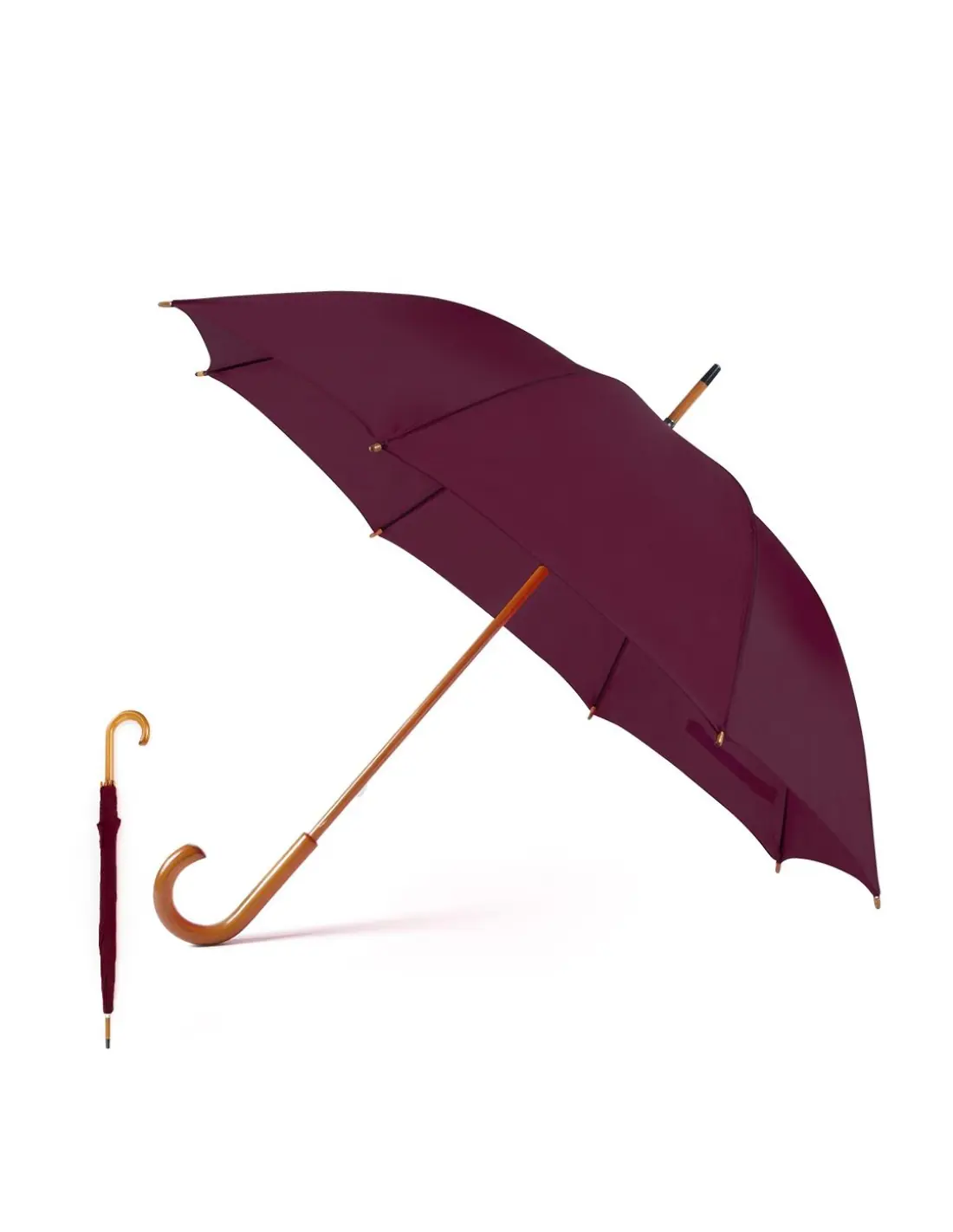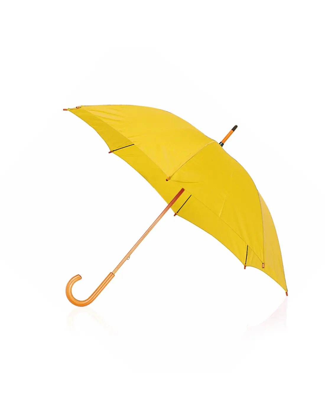 Paraguas de 8 paneles confeccionado en poliéster. De 105cm de diámetro, con apertura manual, varillas metálicas en color negro y cierre de velcro. Palo y mango fabricados en suave madera de color natural, con tela en variada gama de vivos colores.