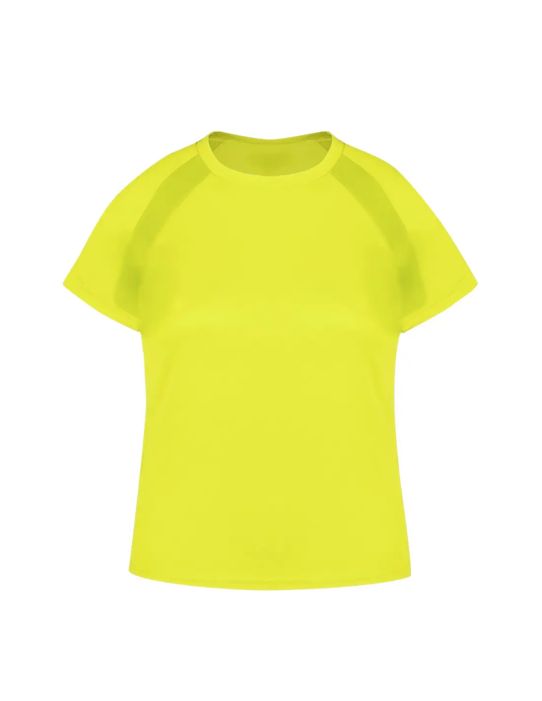 Camiseta técnica para mujer en material 100% poliéster transpirable de 135g/m2. Con manga ranglán, cuello redondo y con bandas frontales y laterales en tejido transpirable microperforado. Disponible en tallas S, M, L, XL.