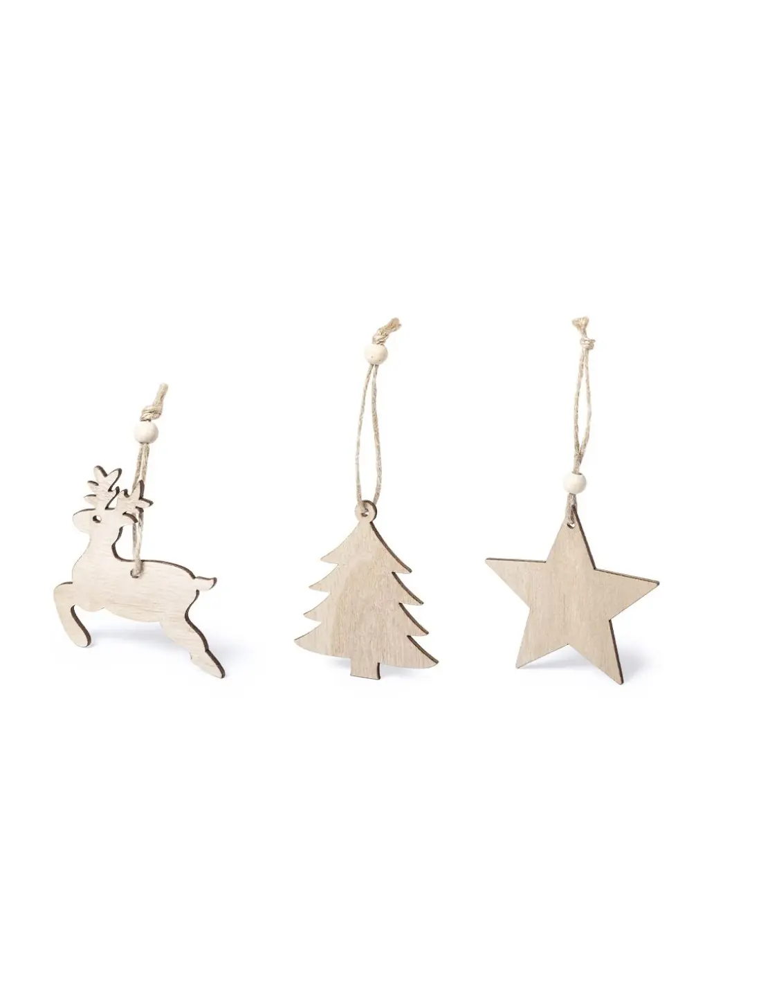 Set de 3 figuras navideñas de línea nature para colgar, fabricadas en madera de tacto suave. Cordón en yute con bolita para ajuste. Incluye reno, estrella y árbol de navidad. Presentado en bolsa individual con cartón interior en color natural.