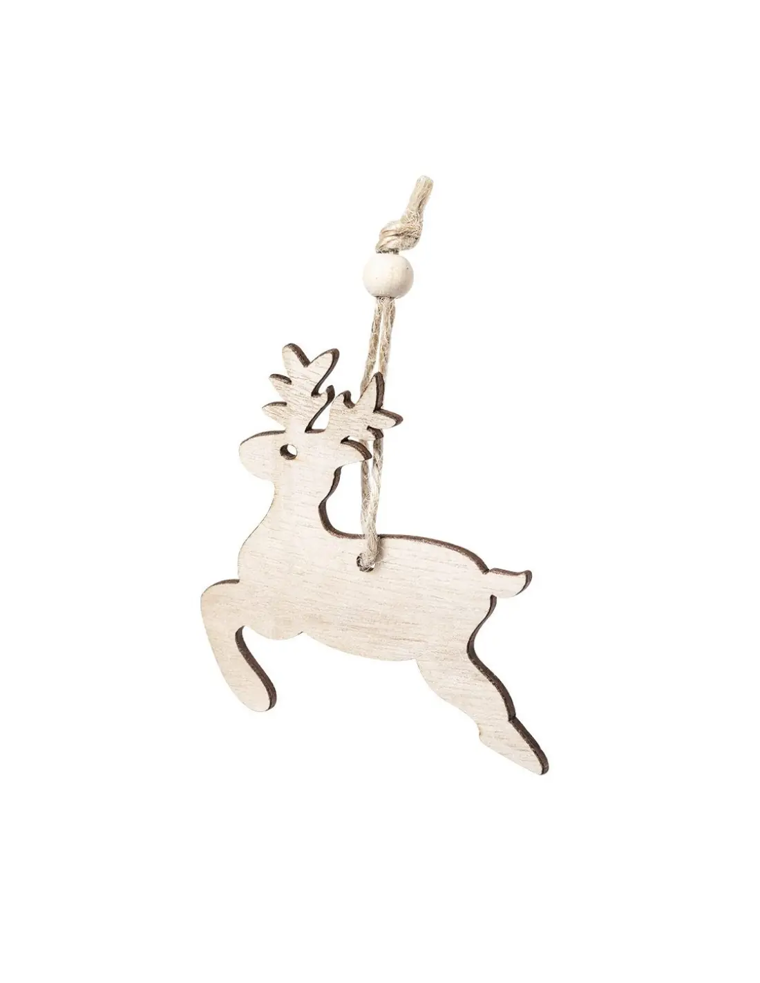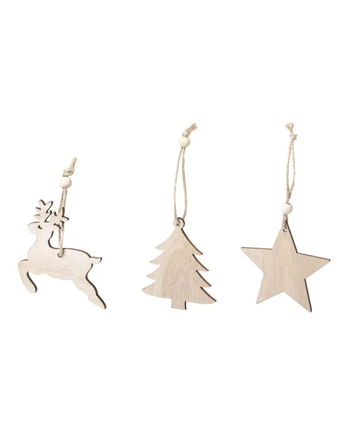 Set de 3 figuras navideñas de línea nature para colgar, fabricadas en madera de tacto suave. Cordón en yute con bolita para ajuste. Incluye reno,...
