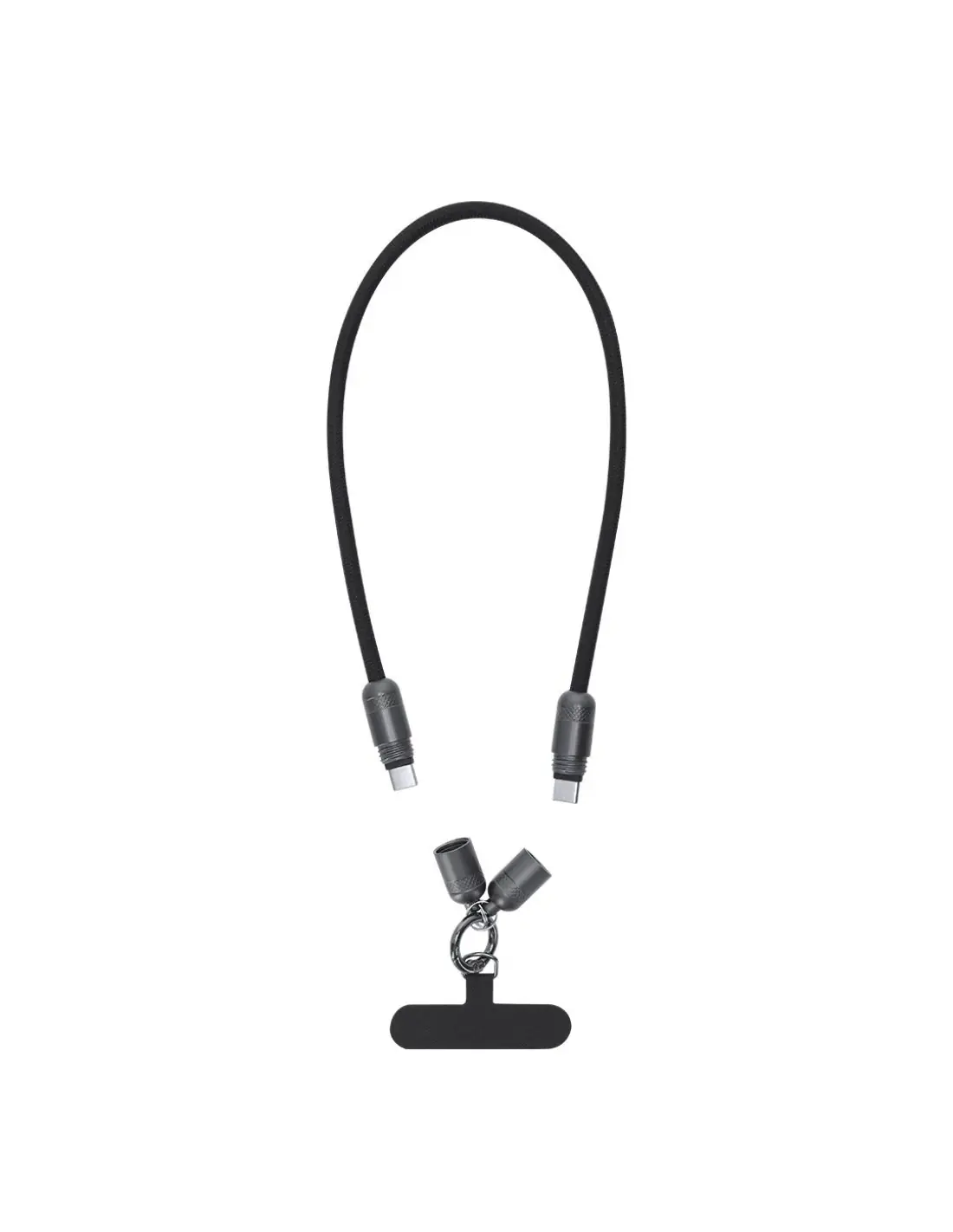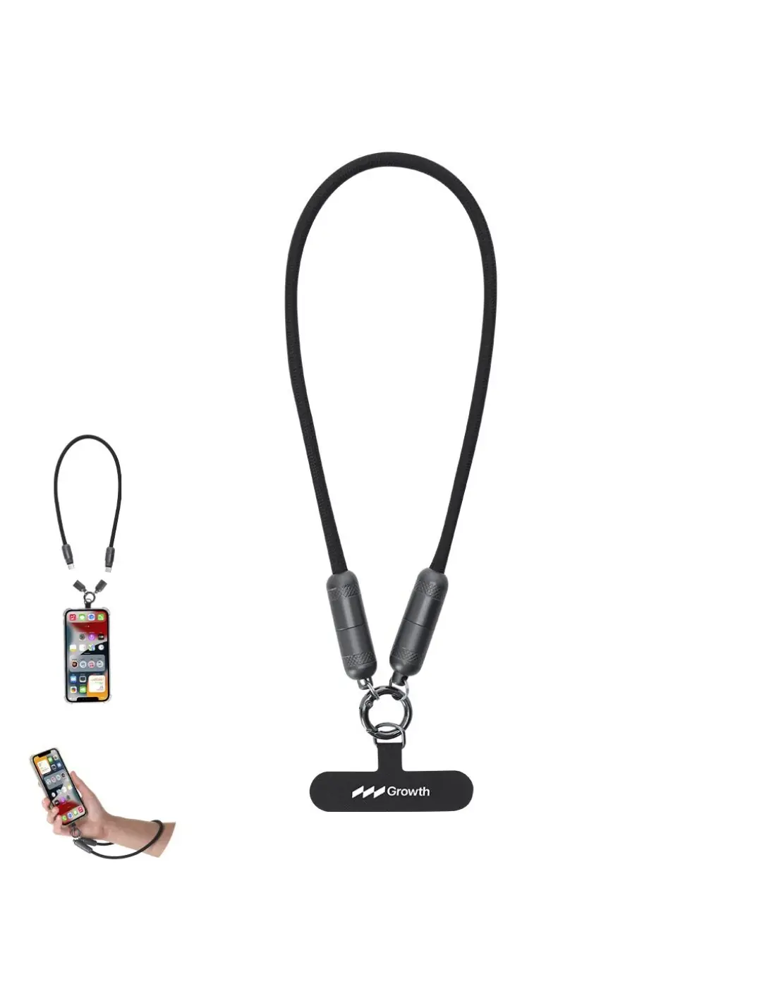 Lanyard cable de carga con función de transferencia de datos y soporte para móvil. Con entrada/salida Tipo C y capacidad de 60W , lo que permite una carga rápida. Funcionalidad y comodidad en un solo accesorio.