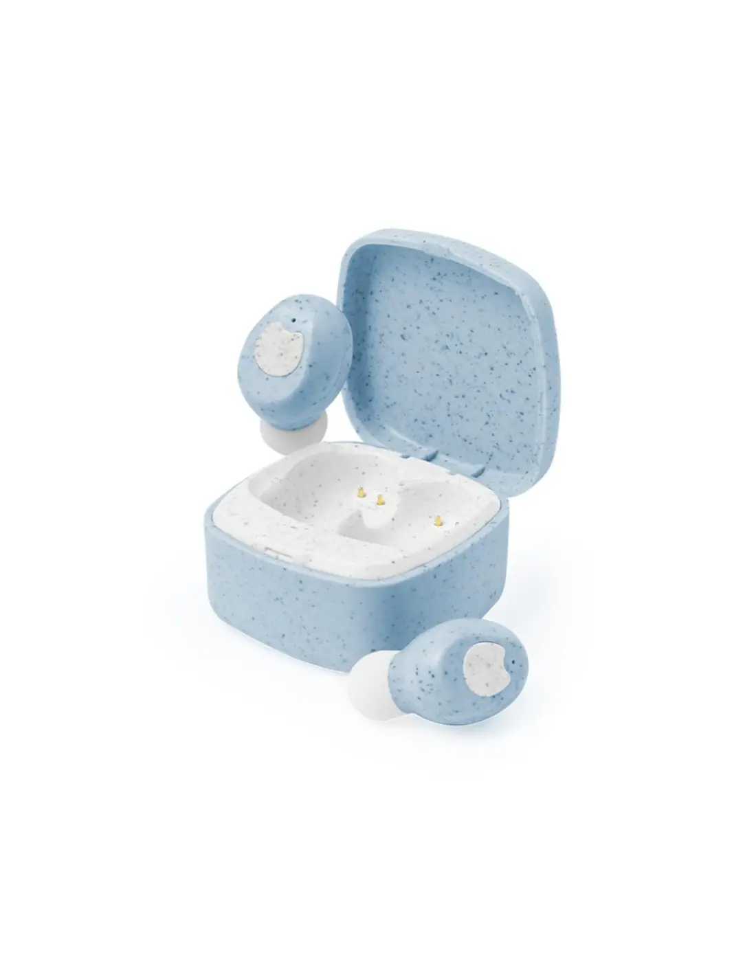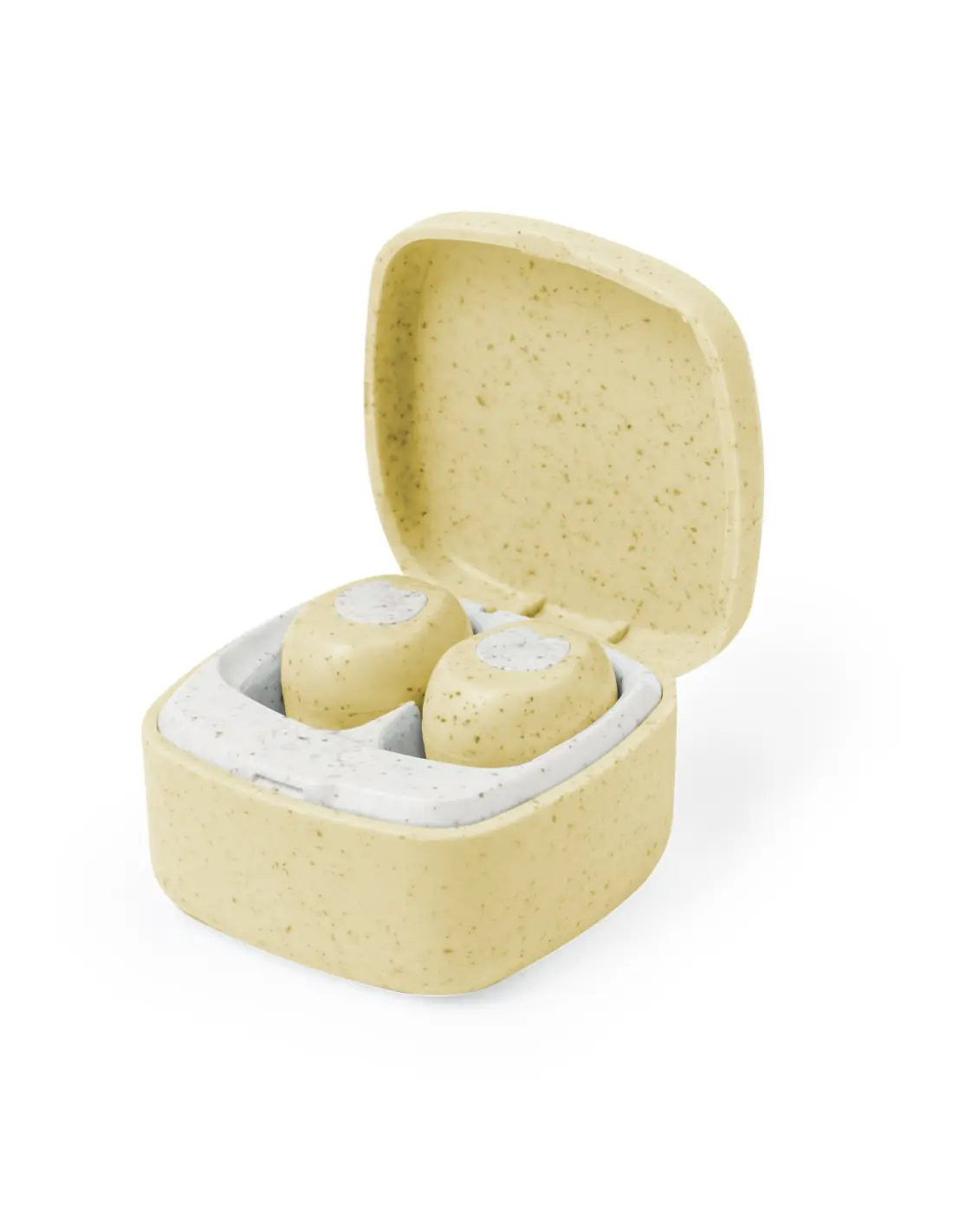 Auriculares intraurales fabricados en caña de trigo, con conexión Bluetooth 5.0. De diseño ergonómico, incluyen botón de control táctil integrado en el auricular, cada uno con una batería de 30 mAh. Base de carga a juego con batería de 200mAh y luz LED de estado de carga. Función manos libres y recargables, con cable Tipo C incluido. Presentados en estuche individual de lujo con tapa de bisagra y en caja de diseño kraft. Disponibles en variada gama de colores, combinando la caña de trigo en color natural con originales tonos. Incluido manual de instrucciones en español e inglés.La caña de trigo fomenta la utilización de materias primas naturales, reduciendo así las emisiones contaminantes.Fabricados conforme a los estándares RoHS y en cumplimiento con los siguientes requisitos de seguridad:Sistema de protección contra sobrecalentamiento.Sistema de protección contra sobrecarga.Sistema de bloqueo para evitar cortocircuitos.