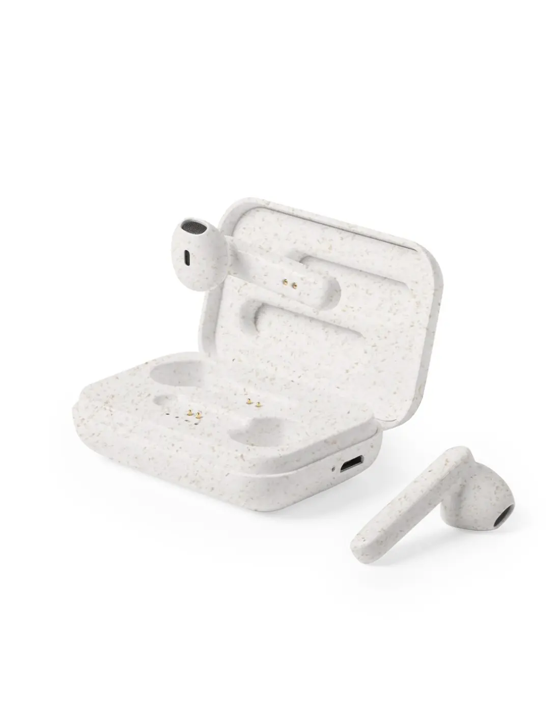 Auriculares intraurales de línea nature. Conexión Bluetooth 5.0 y carcasa en caña de trigo, para así fomentar la utilización de materias primas naturales y reducir las emisiones contaminantes. De diseño ergonómico, incluyen botón de control táctil integrado en el auricular, con base de carga a juego y luz LED de estado de carga. Función manos libres y recargables, con cable micro USB incluido. Presentados en estuche individual de lujo con tapa de bisagra y en atractiva caja de diseño eco.