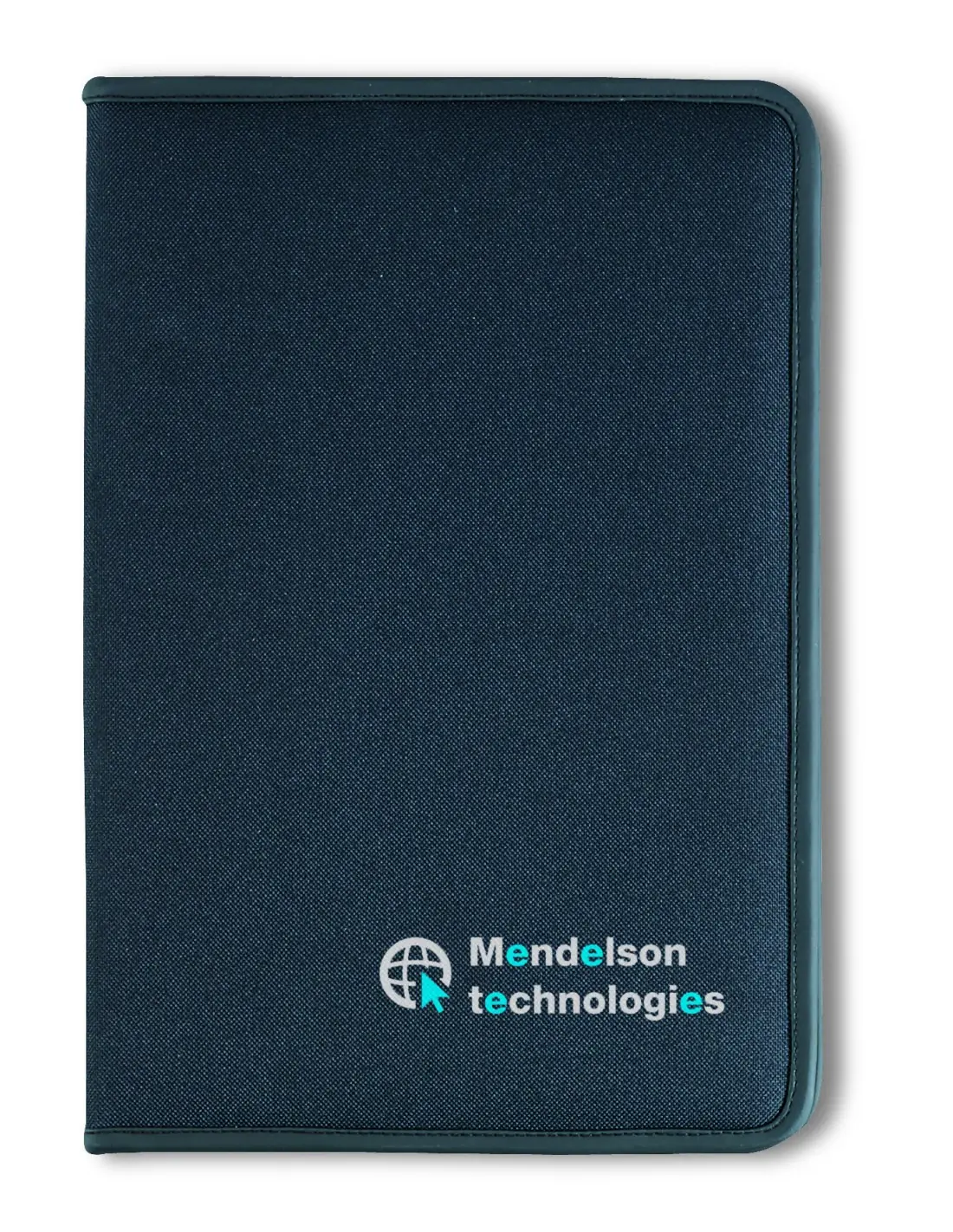 Porta documentos A4 con cremallera, 4 compartimentos y porta tarjetas. Incluye bloc de notas de 20 hojas de papel reciclado. Material poliéster 600D, forro 210T.