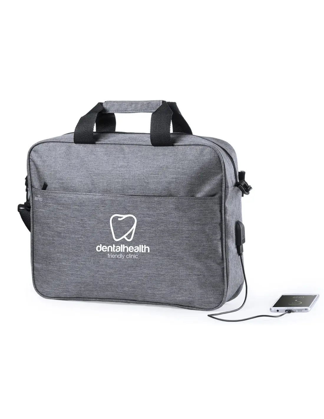 Portadocumentos de seguridad, con diseño urbano en resistente poliéster 300D. Bolsillo interior con protección de seguridad RFID (Identificación por Radio Frecuencia) que mantiene seguros los datos de la tarjeta y demás dispositivos. Asas con protección y compartimento principal con cierre de cremallera. Conexión USB -powerbank no incluido-, con bolsillos interiores acolchados para ordenador portátil de hasta 15 pulgadas y tablets de hasta 10 pulgadas. Cinta para hombro ajustable con protector acolchado.