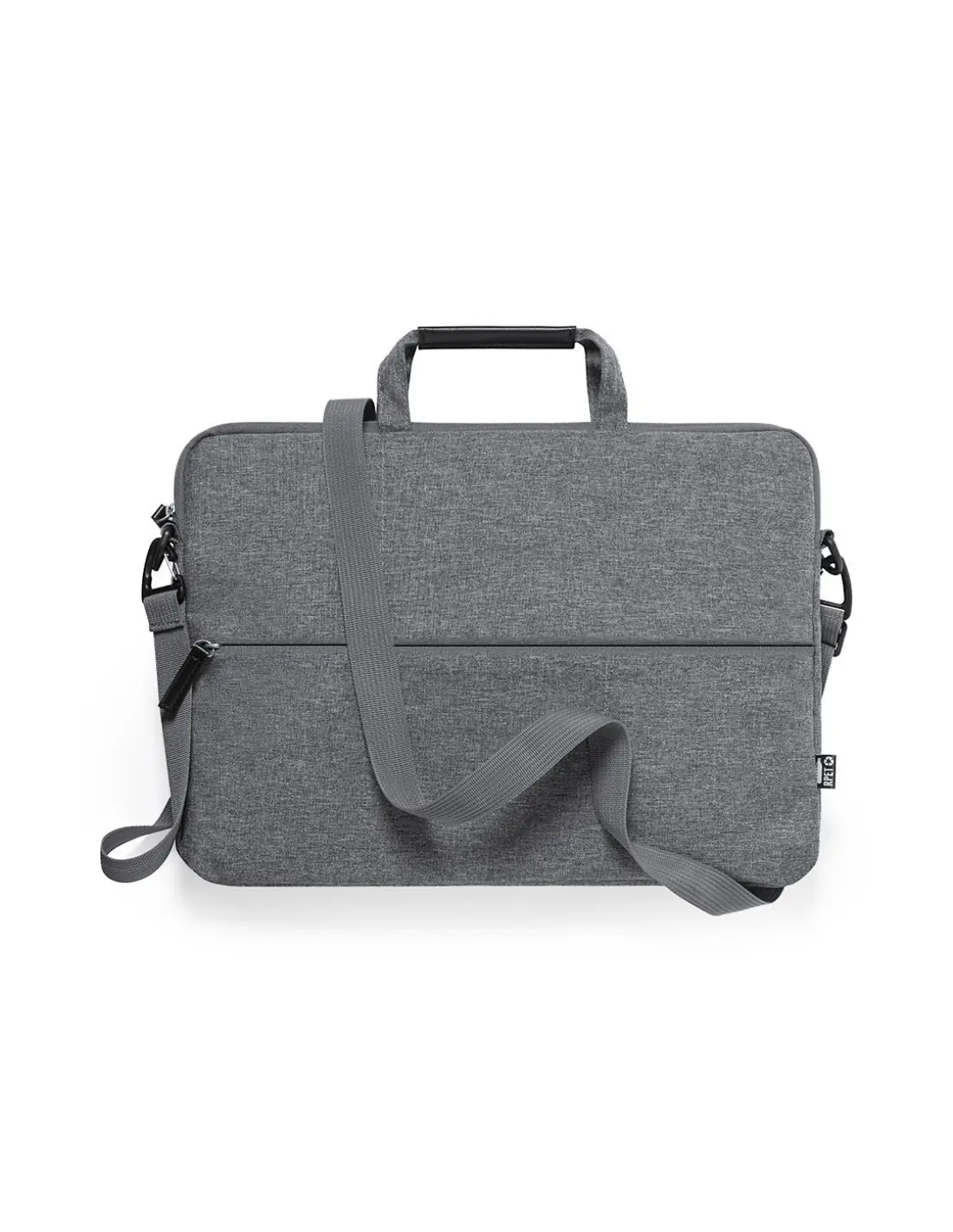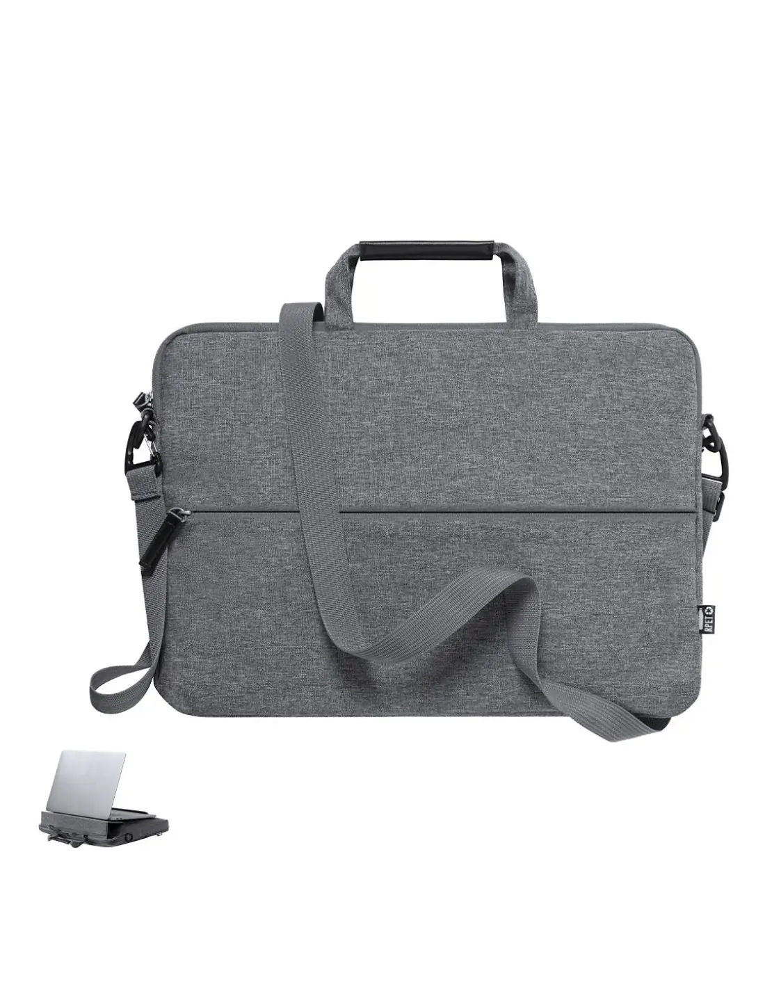 Portadocumentos de línea nature y en resistente 300D RPET efecto melange, elaborado a partir de plástico reciclado, para así fomentar la reutilización de residuos plásticos y contribuir a la sostenibilidad del planeta. Con original soporte integrado para ordenador portátil, bolsillos principal y frontal con cierre de cremallera. Interior con bolsillo acolchado para portátil de hasta 15 pulgadas y bolsillo para tablet de hasta 10 pulgadas. Cinta bandolera ajustable para hombro, con asa de transporte reforzada. Resistencia hasta 6kg, con distintivo RPET en etiqueta exterior.