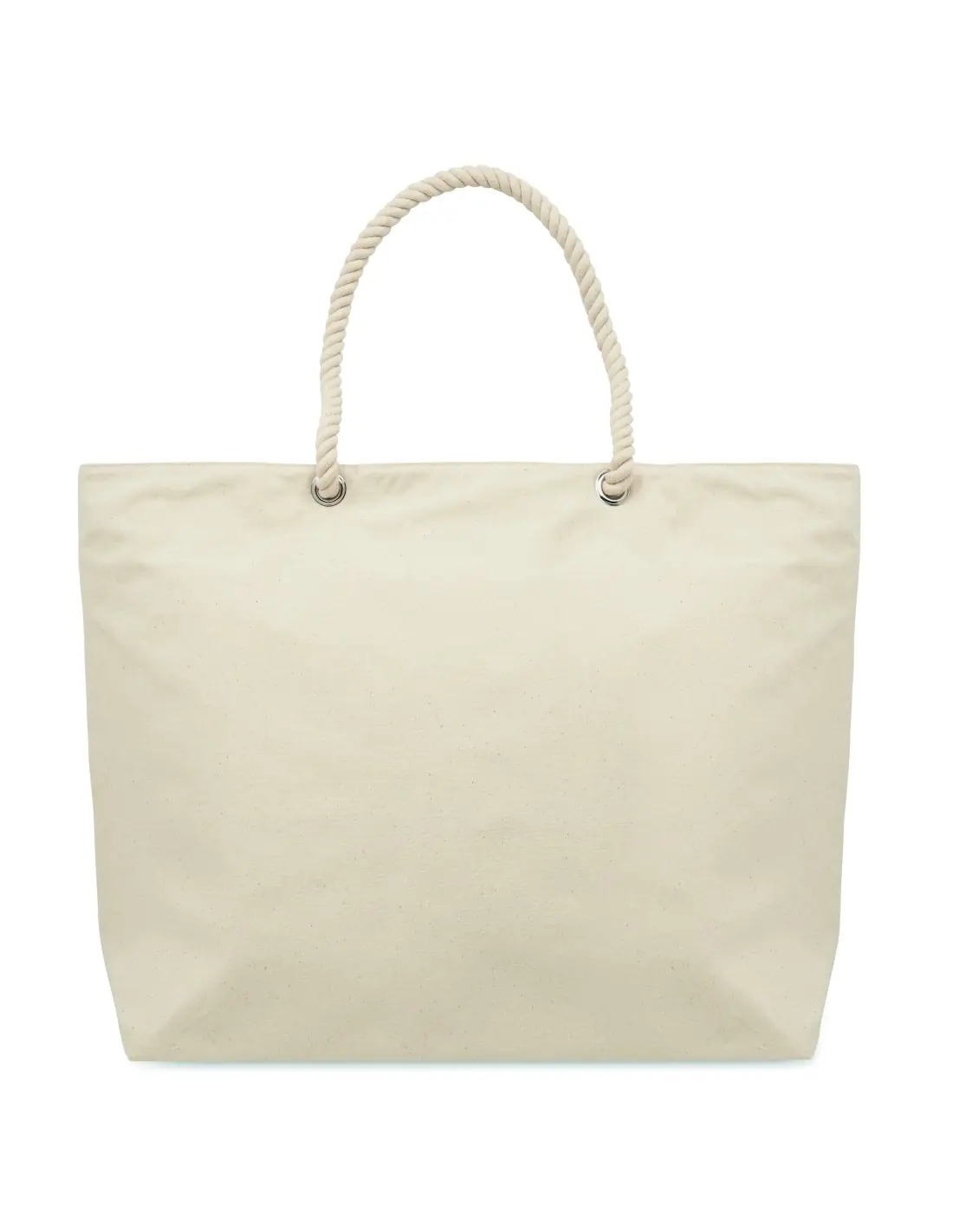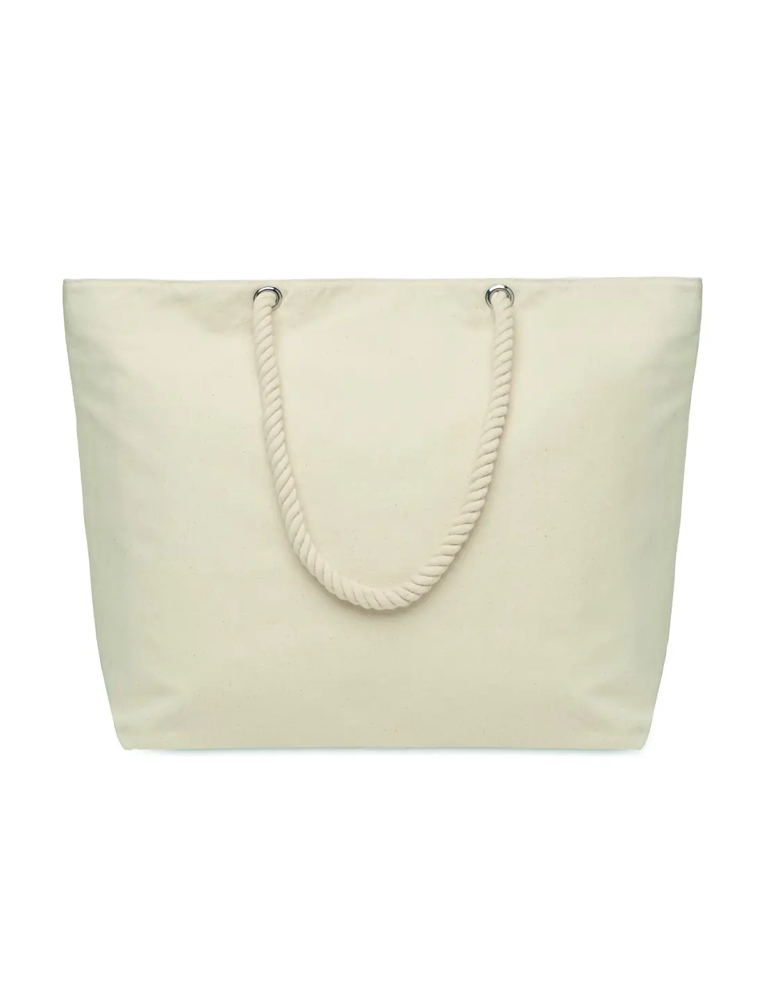 Bolsa nevera de playa de algodón con cremallera y asa de cuerda. 220 gr/m². Aislamiento de aluminio laminado de 2 mm.