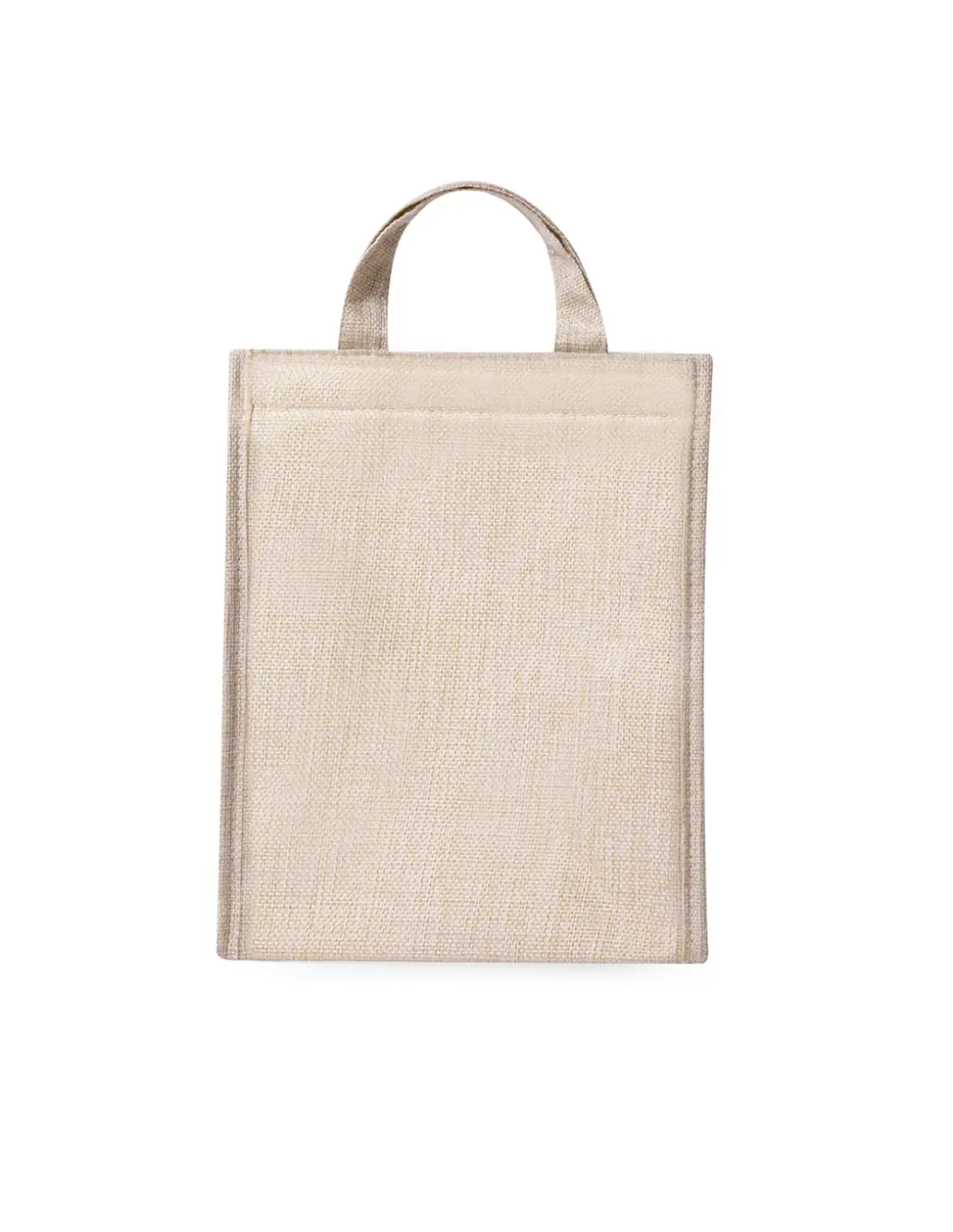 Bolsa nevera fabricada en resistente poliéster. Cierre de velcro y asas con refuerzo. Disponible en color natural.
