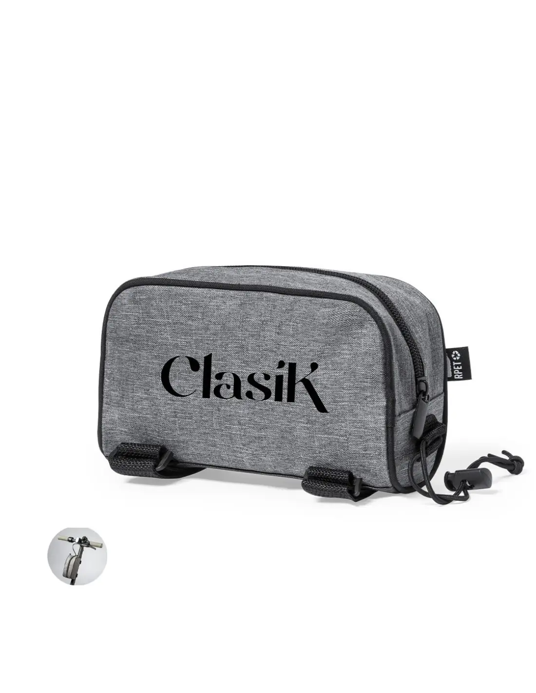 Bolsa para barra de patinete fabricada en resistente 600D RPET. De acabado gris jaspeado.con ribetes de refuerzo y compartimento principal con cierre...