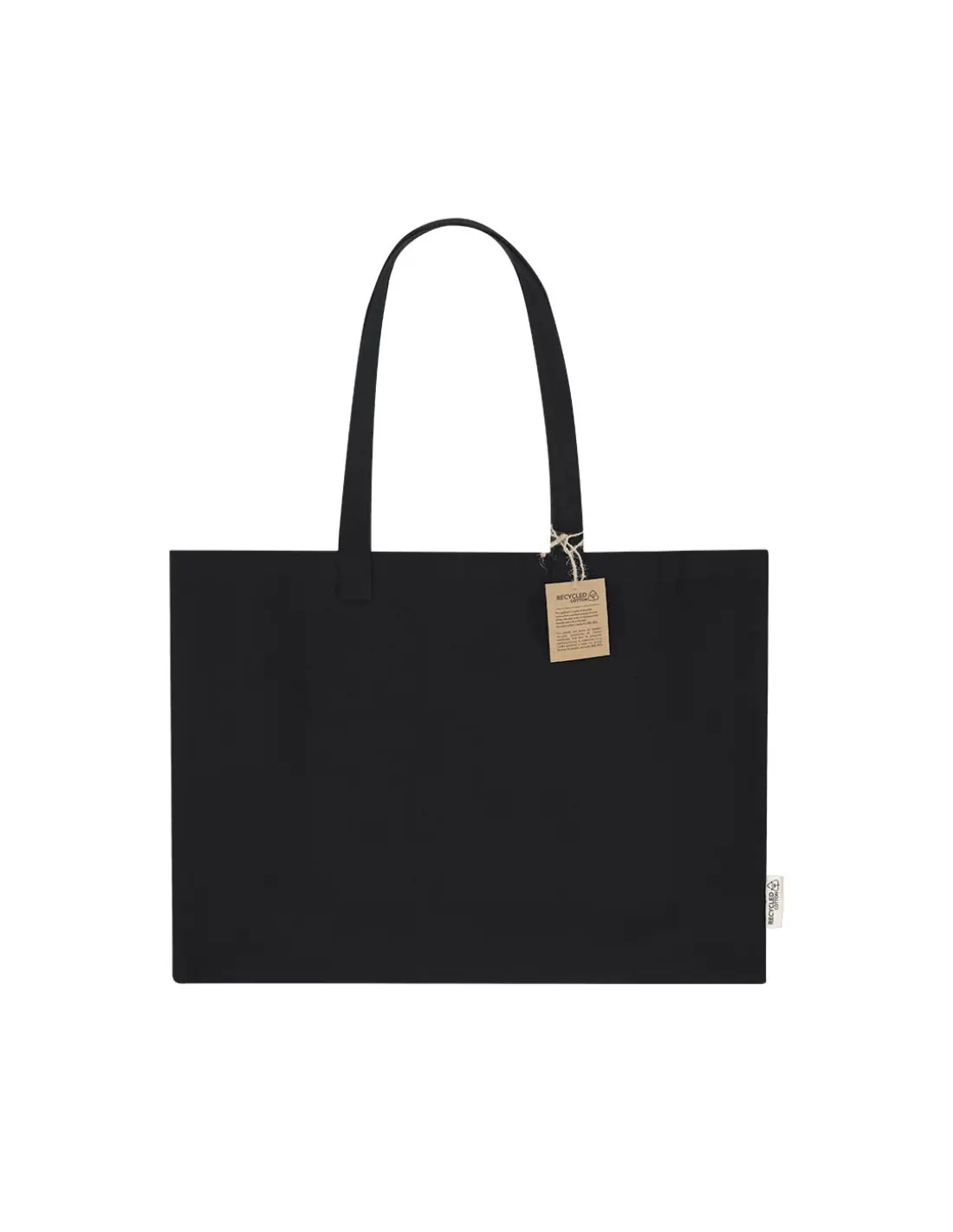 Bolsa confeccionada principalmente en resistente algodón reciclado de 300g/m2. De acabado cosido con fuelle y asas largas de 70cm reforzadas. Logotipo en etiqueta lateral y resistencia hasta 10kg de peso.
