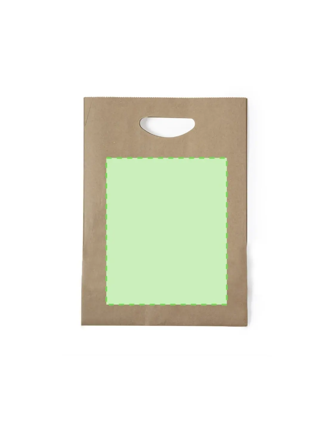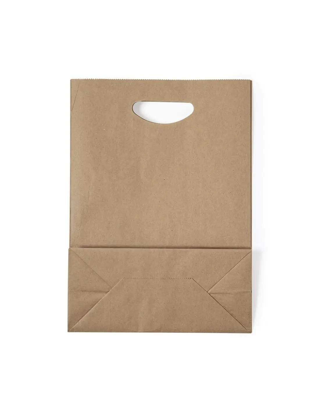 Bolsa ligera de línea nature fabricada en papel reciclado de 80g/m2. Con original asa troquelada y fuelle.
