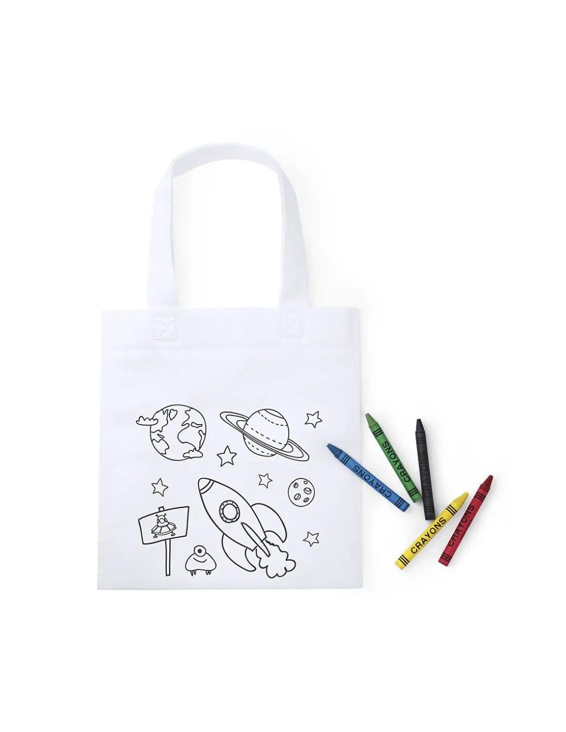 Bolsa de non-woven en color blanco especialmente diseñada para colorear con ceras. Incluye 5 ceras de cuerpo cilíndrico en variados colores. Asas largas de 33cm y acabado termosellado.