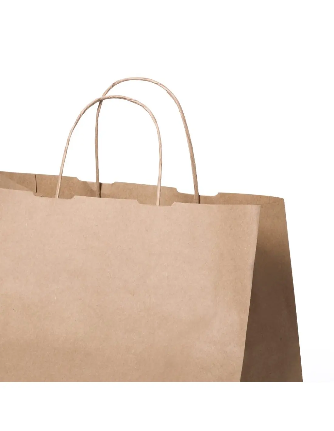 Bolsa en papel de acabado natural de 80g/m2 con asas cortas reforzadas y fuelle. Resistencia hasta 5kg de peso.