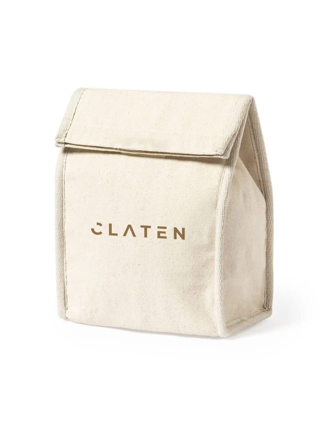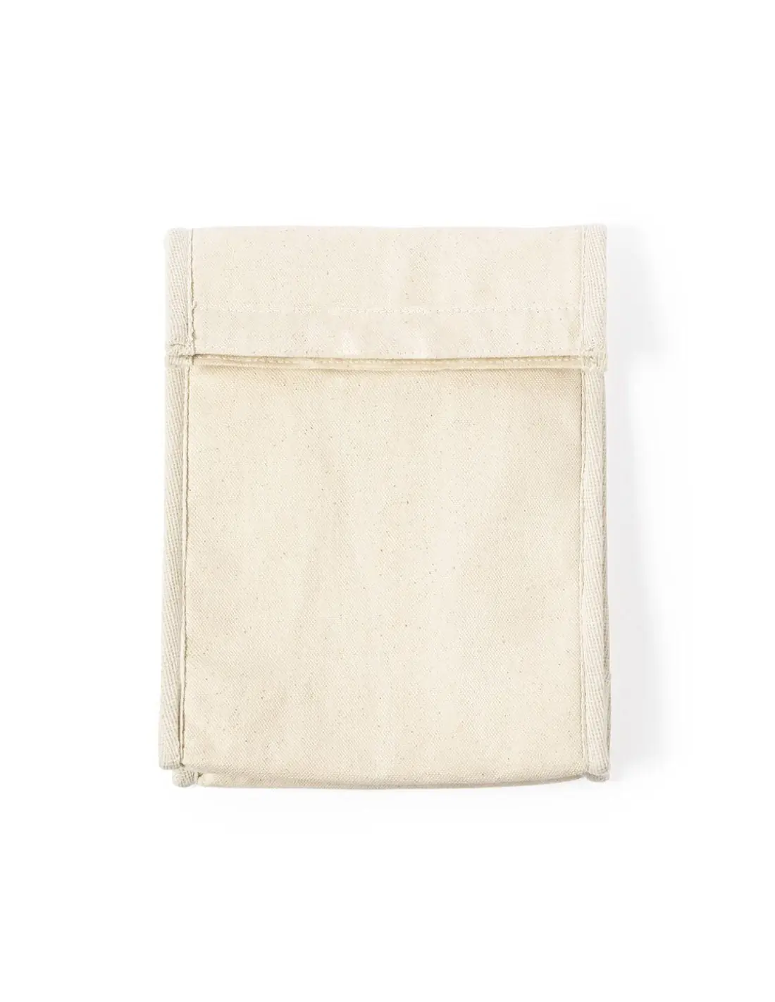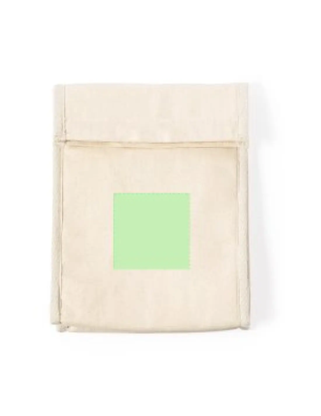 Bolsa térmica en resistente material 100% algodón de 330g/m2. Compartimento principal con cierre de velcro e interior isotermo de aluminio. Capacidad 2,3l.