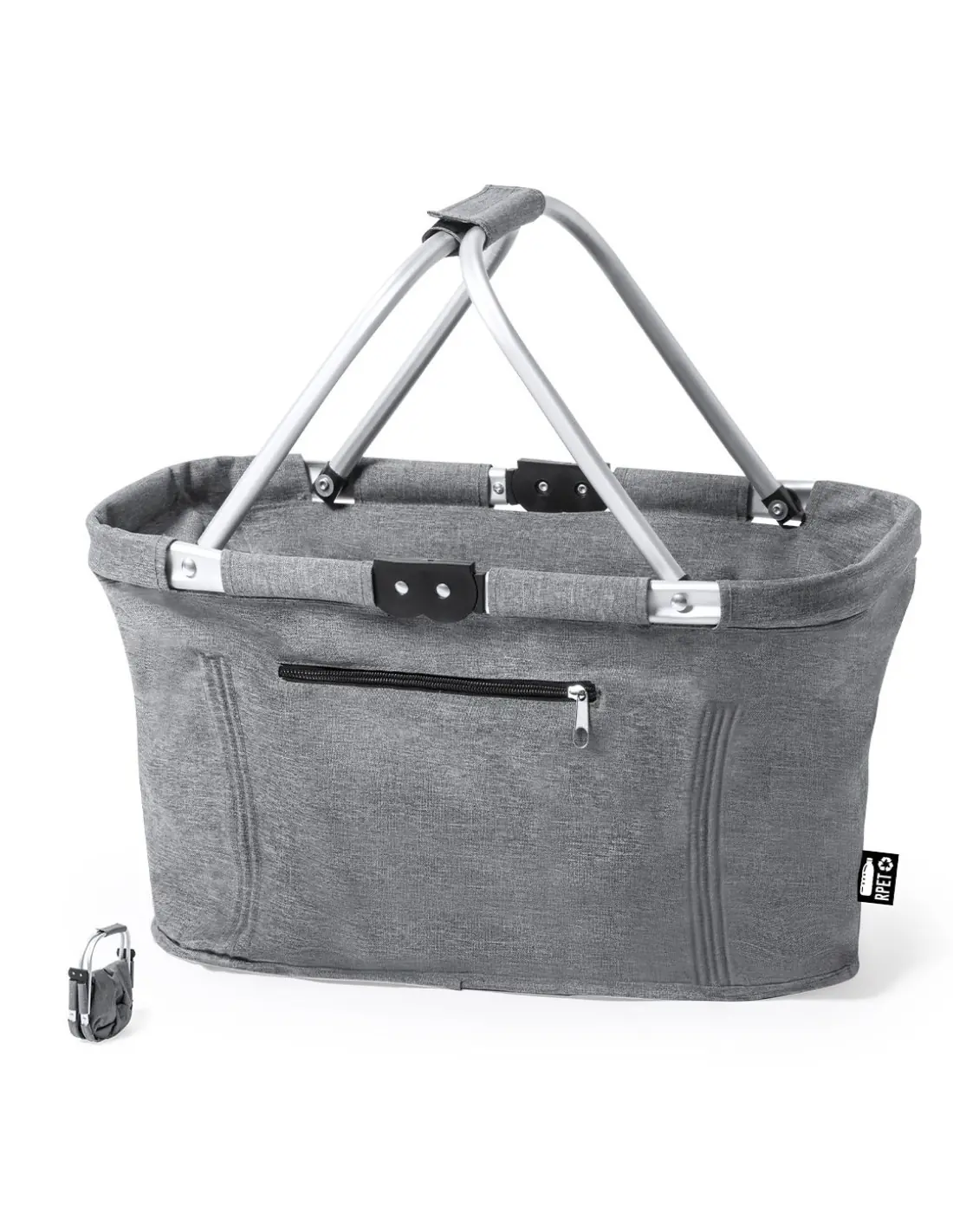 Cesta plegable fabricada en resistente 600D RPET. Con resistente estructura de aluminio y 2 asas de transporte plegables en aluminio, con cinta de velcro a juego. Bolsillo exterior con cierre de cremallera y etiqueta exterior con distintivo RPET. El material RPET se elabora a partir de plástico reciclado, para así fomentar la reutilización de residuos plásticos y ayudar a la sostenibilidad del planeta.