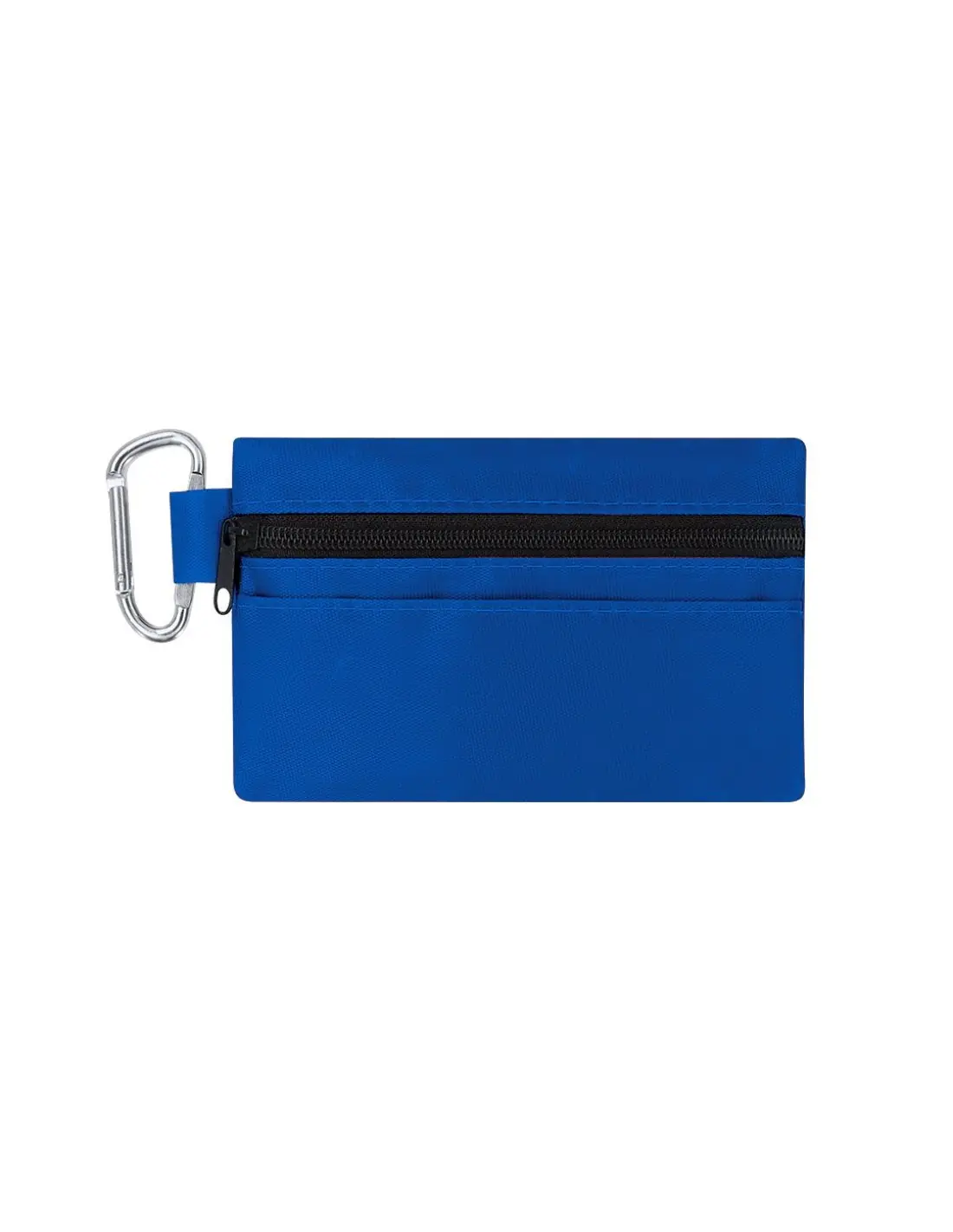 Kit de emergencia de 14 accesorios en resistente estuche de poliéster 600D, con cierre de cremallera, bolsillo frontal y mosquetón metálico. Incluye vendas, toallitas, toallas con alcohol y toallita alivia picaduras.