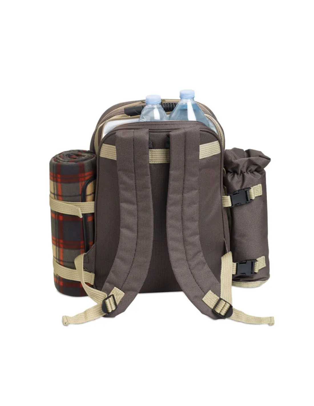 Mochila de picnic para 4 personas que incluye manta, porta botellas y accesorios de mesa de calidad. Bolsa poliéster 600D.