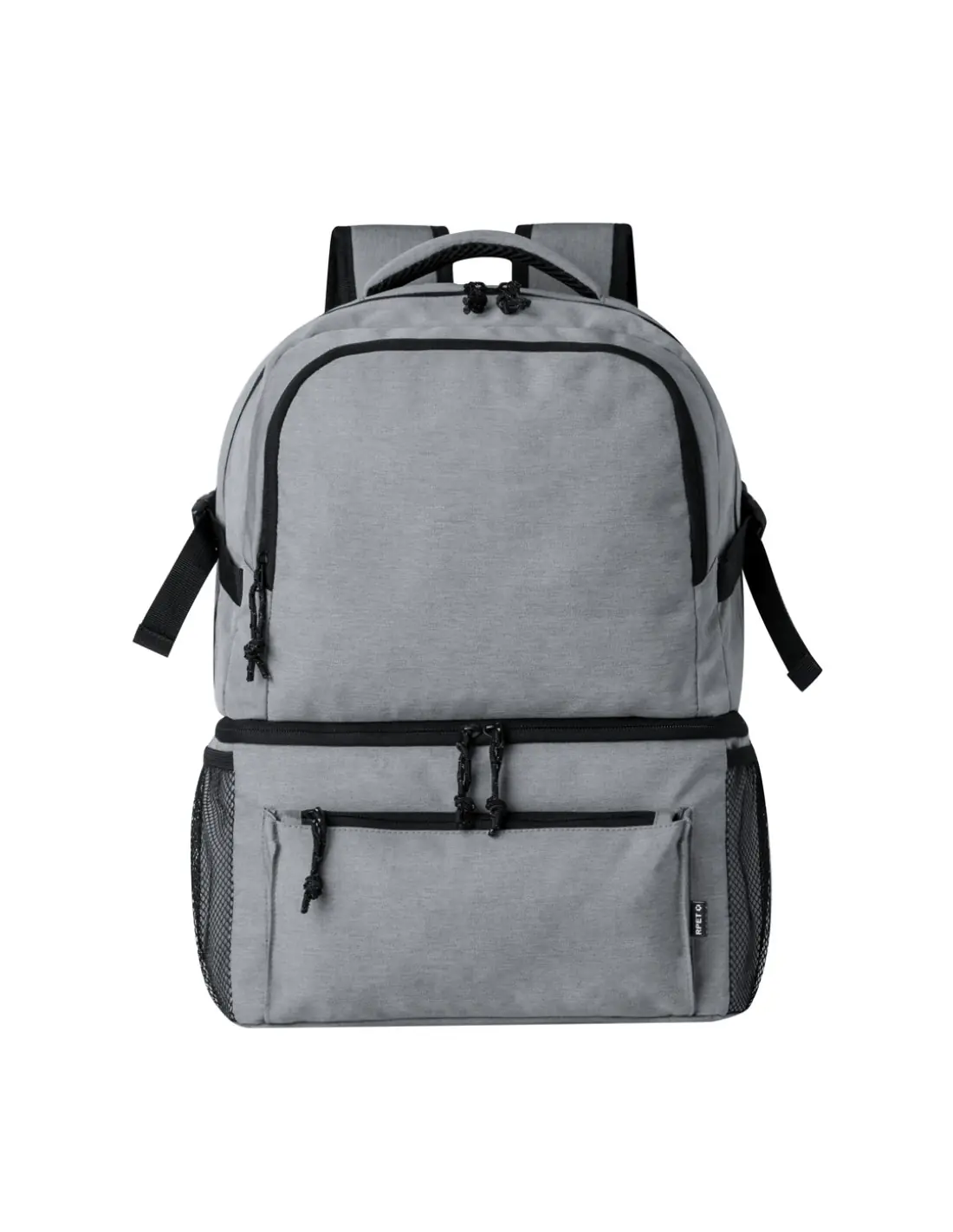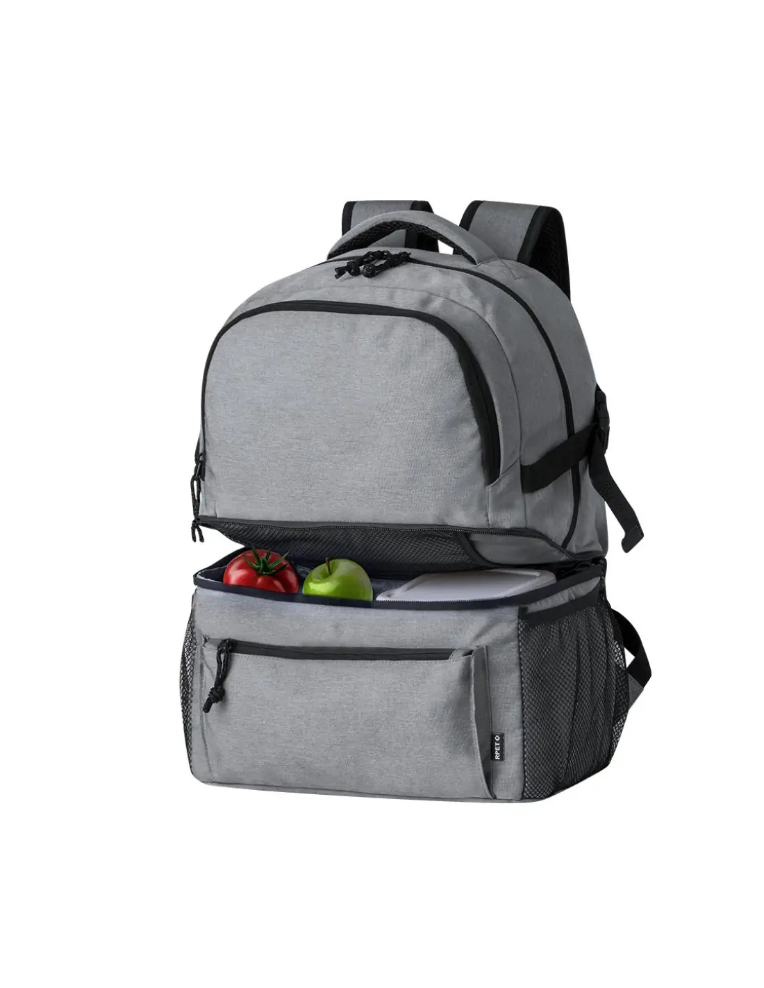 Mochila multiusos fabricada en resistente poliéster 600D RPET, con un diseño urbano y práctico. Destaca por su compartimento isotérmico independiente en la base, forrado con PEVA para mantener la temperatura. El compartimento principal se cierra con cremallera, de doble tirador, y cuenta con bolsillos frontales y laterales de malla para mayor versatilidad. Las cintas de hombros son acolchadas y ajustables. Además, dispone de un asa de mano acolchada en la parte superior. Etiqueta distintiva de RPET. Presentada individualmente en bolsa reciclada.El material RPET se elabora a partir de plástico reciclado, para así fomentar la reutilización de residuos plásticos y ayudar a la sostenibilidad del planeta.