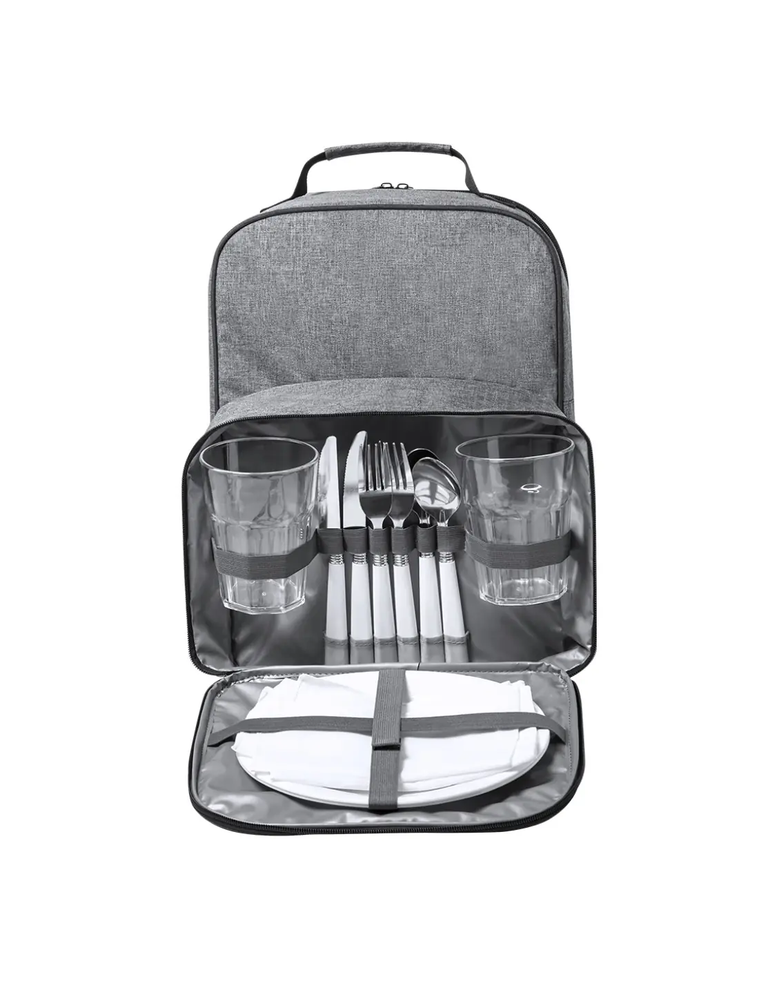 Mochila nevera para picnic de línea nature, fabricada en resistente RPET 600D de alta calidad, elaborado a partir de plástico reciclado para así fomentar la reutilización de residuos plásticos y contribuir a la sostenibilidad del planeta. Ideal para 2 personas, con bolsillo independiente para un almacenaje seguro. Incluye 2 vasos, 2 cuchillos, 2 cucharas, 2 tenedores, 2 platos y 2 servilletas. Compartimento nevera con interior en PEVA y cómoda asa de transporte. Cintas y parte trasera acolchadas. Distintivo RPET en etiqueta.