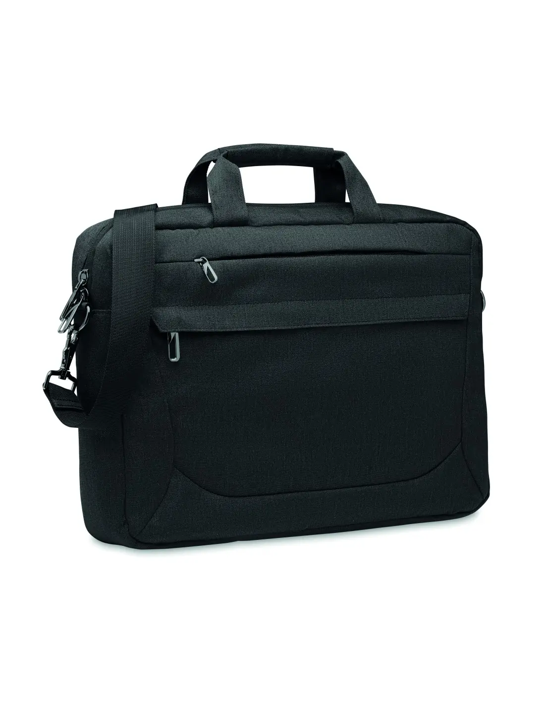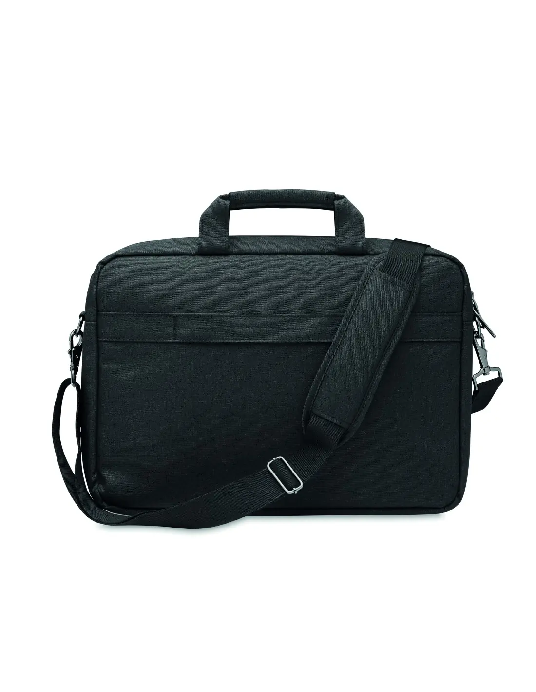 Maletín de ordenador portátil de 15'' en poliéster RPET 600D. 2 compartimentos principales internos tanto para portátil como para tablet y gran bolsillo frontal con cremallera. Dispone de un pequeño bolsillo con cremallera. Tirantes desmontables y ajustables. Soporte para trolley en el reverso.