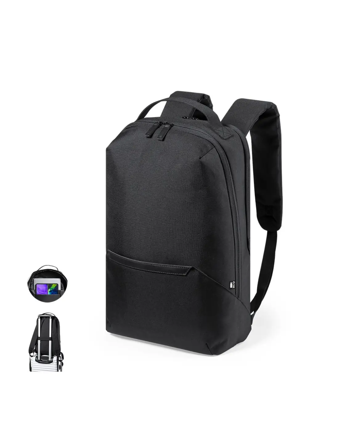 Mochila fabricada en resistente poliéster 600D RPET, elaborado a partir de plástico reciclado, para así fomentar la reutilización de residuos plásticos y ayudar a la sostenibilidad del planeta. Compartimento principal con cierre de cremallera de doble tirador y bolsillo en frontal. Interior con bolsillos acolchados para tablet de hasta 10 pulgadas y ordenador portátil de hasta 15 pulgadas. Accesorio de ajuste en trolley, con bolsillo antirrobo en parte trasera. Espalda y cintas de hombros acolchadas y ajustables, con distintivo RPET en etiqueta.