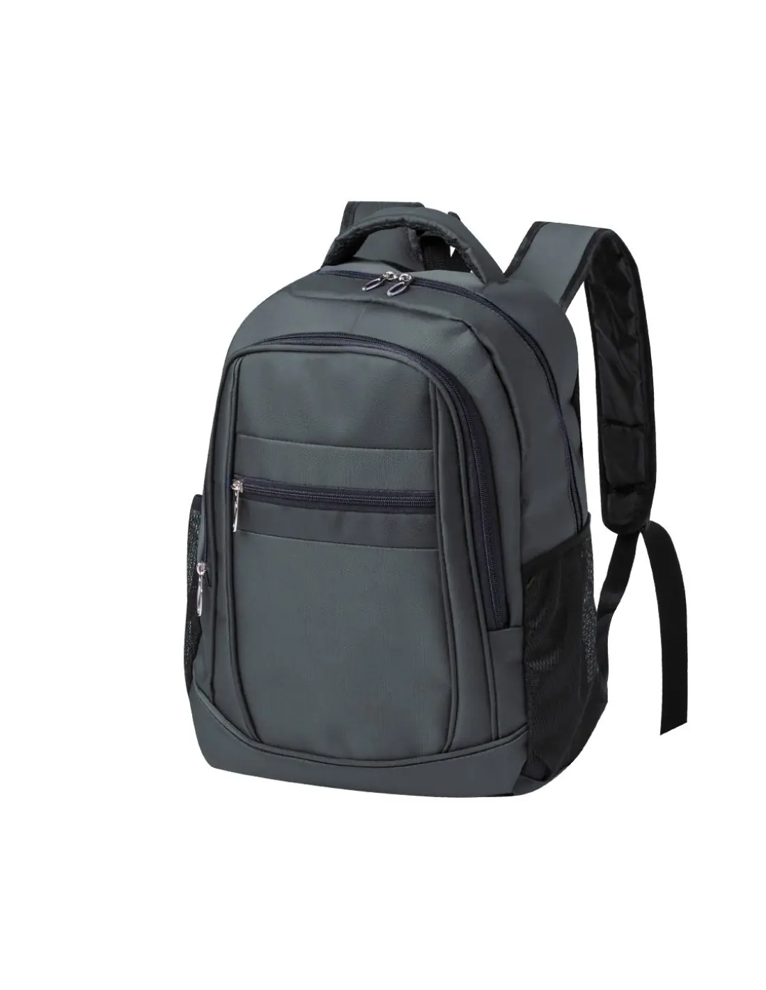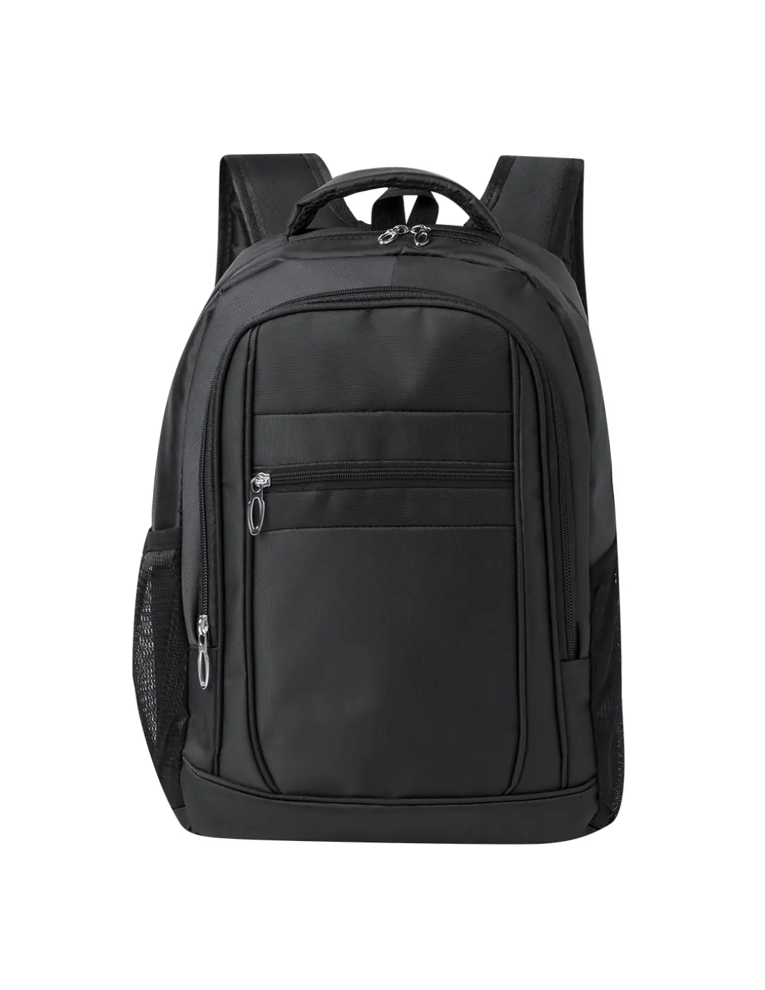 Mochila confeccionada en resistente 600D Nylon. Cuenta con un bolsillo principal con cierre de cremallera, y doble tirador. Interior con bolsillos acolchados destinados a tablet de hasta 10 pulgadas y portátil de hasta 15 pulgadas. Además, lleva dos bolsillos frontales adicionales. Tanto la espalda como las cintas de hombros son acolchadas y ajustables, fabricadas con un tejido transpirable. Presenta una cómoda cinta superior acolchada y bolsillos laterales de rejilla. Disponible en elegantes colores, con complementos en negro. Presentado en una bolsa individual.