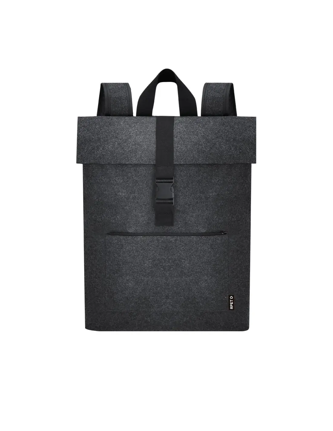 Mochila de fieltro RPET. Cuenta con bolsillo principal con cierre de hebilla y bolsillo frontal adicional con cierre de cremallera. Equipada con cintas para los hombros ajustables y reforzadas y asa superior. Incluye distintivo RPET en etiqueta exterior.El fieltro RPET es fruto de la combinación del proceso de reciclaje de materiales plásticos junto con la técnica milenaria de fabricación del fieltro, dando como resultado un material de eco-tendencia que, además de ser de origen reciclado, también se convierte en reciclable.