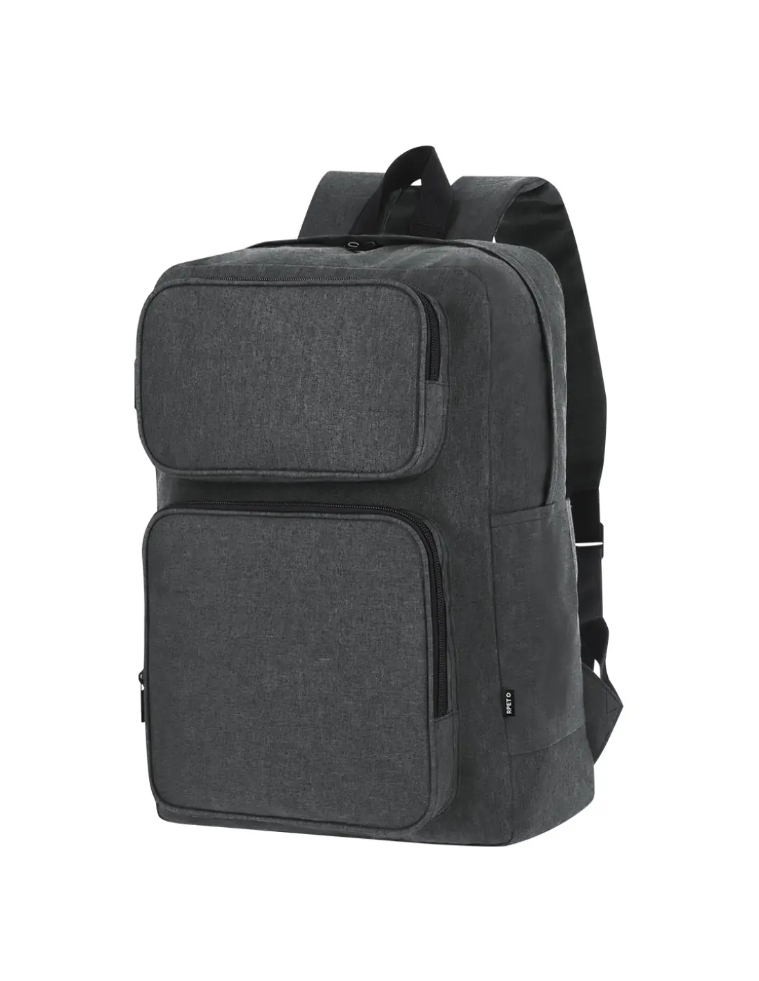 Mochila fabricada en suave poliéster RPET 600D. Con bolsillo principal de cierre de cremallera con doble tirador. Bolsillo interior para portátil de hasta 15 pulgadas y Tablet de hasta 10 pulgadas. Incluye dos bolsillos frontales con cierre de cremallera y bolsillos en los laterales. Espalda y cintas acolchadas ajustables. Incluye cinta de transporte para ajuste en trolley o maleta, ideal para viajes. Con distintivo de RPET en etiqueta.El material RPET se elabora a partir de plástico reciclado, para así fomentar la reutilización de residuos plásticos y ayudar a la sostenibilidad del planeta.