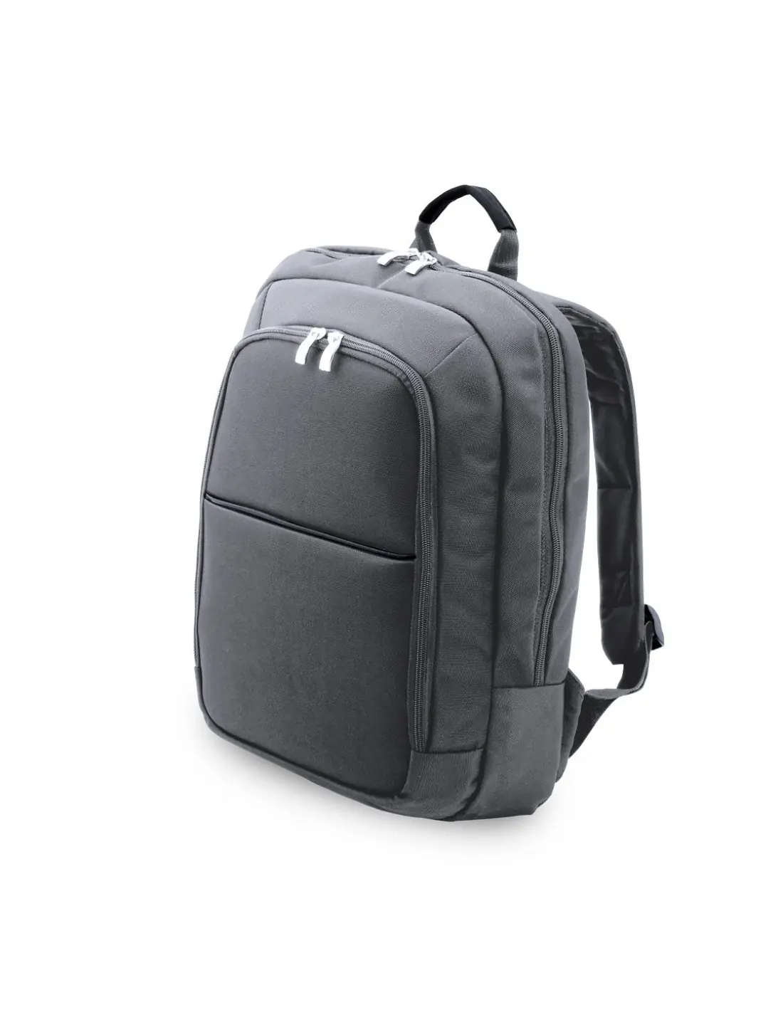 Mochila de resistente nylon 900D de sobrio diseño con cierre de cremallera, bolsillo frontal y asa reforzada. Con acolchado en espalda y cintas de hombros, incluye compartimento interior acolchado para ordenador portátil de hasta 14 pulgadas.