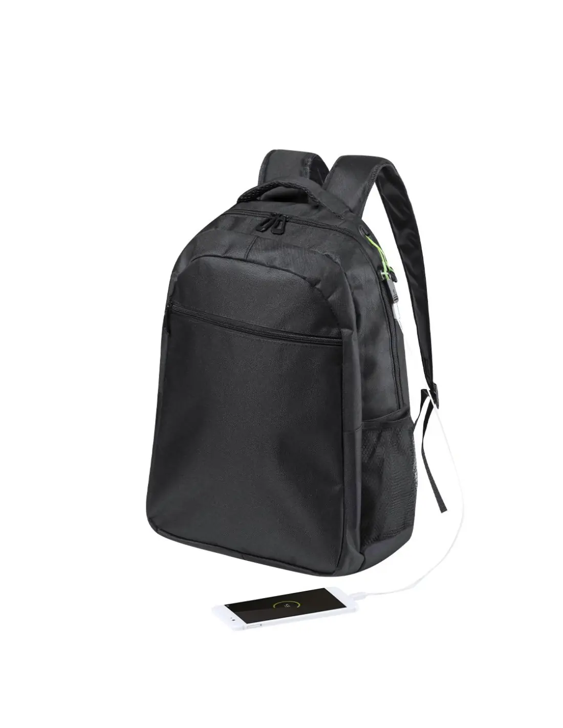 Mochila de resistente poliéster 600D en elegante acabado impermeable de color negro y salida para auriculares. Con compartimento interior con salida USB para conexión de powerbank -no incluido-. Interior con compartimento acolchado para ordenador portátil de hasta 15 pulgadas y tablets de hasta 10 pulgadas. Multitud de bolsillos interiores y exteriores. Cintas de hombros y espalda con acolchado ergonómico.