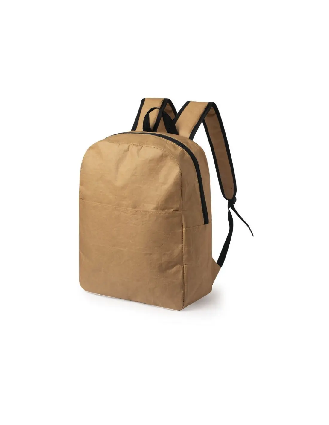 Innovadora mochila en papel laminado ultra resistente de 130 g/m2, resistente a las salpicaduras de agua. Con cierre de cremallera, bolsillo en frontal y bolsillo lateral de gran capacidad. Asa de transporte y accesorios en color negro, con cintas de hombros acolchadas y ajustables.