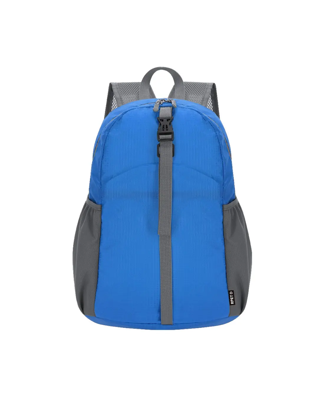 Mochila plegable en suave poliéster Ripstop RPET 210D. Bolsillo principal con cierre de doble tirador, bolsillo interior de doble función y bolsillo frontal con cierre de clip. Esquinas reforzadas con rejillas, cintas de hombros regulables y accesorios en color gris. Plegado de pequeño tamaño, con asa de transporte. Distintivo RPET en etiqueta.El material RPET se elabora a partir de plástico reciclado, para así fomentar la reutilización de residuos plásticos y ayudar a la sostenibilidad del planeta.
