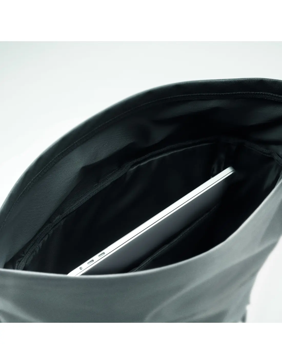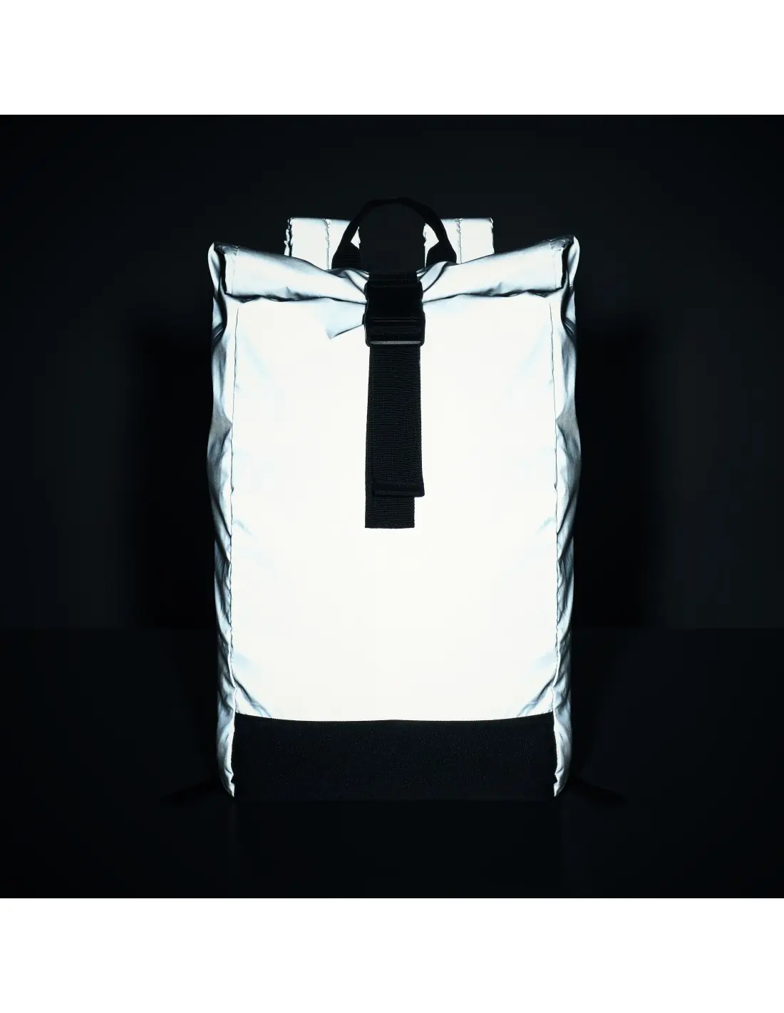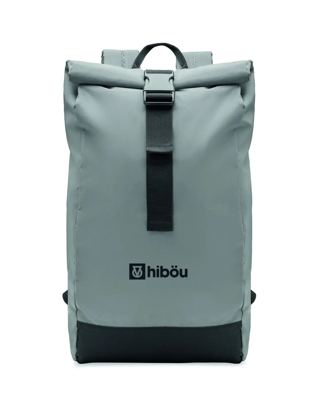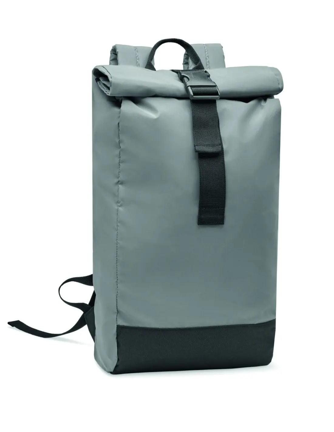 Mochila cierre roll top para portátil de 15'' en poliéster de 190T altamente reflectante. Lado interior adicional con cierre de gancho y bucle. Espalda, correas y parte inferior acolchadas. Bolsillo frontal con cremallera. Parte inferior en poliéster reciclado 600D.
