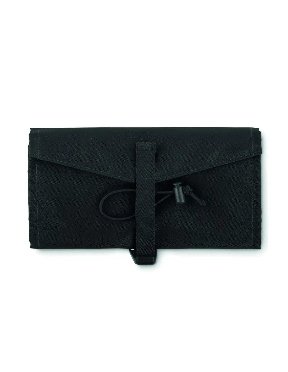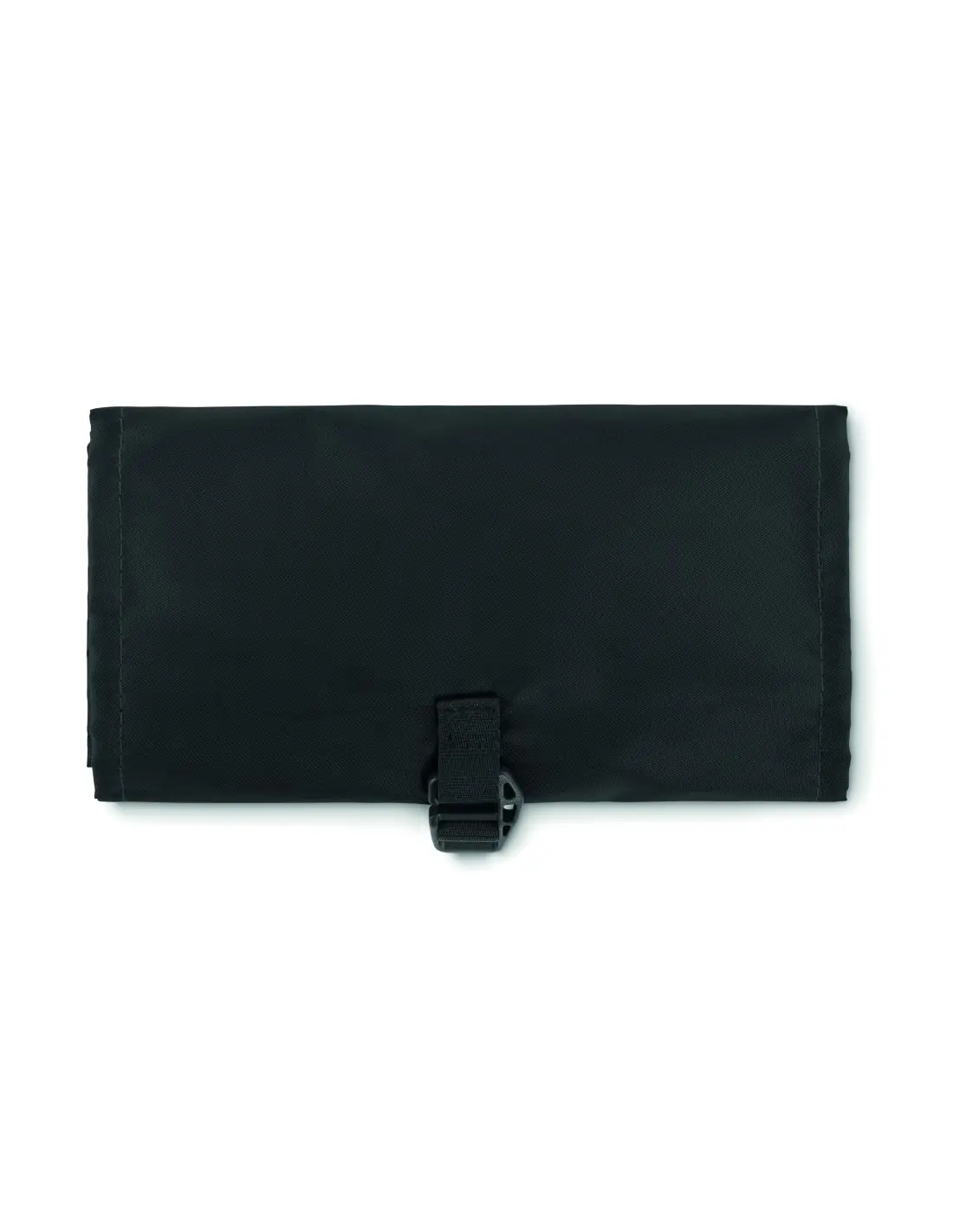 Bolsa enrollable organizadora de cables en RPET 210D. Tiene una malla RPET con 3 compartimentos con cremallera. Esta bolsa también se puede utilizar como neceser.