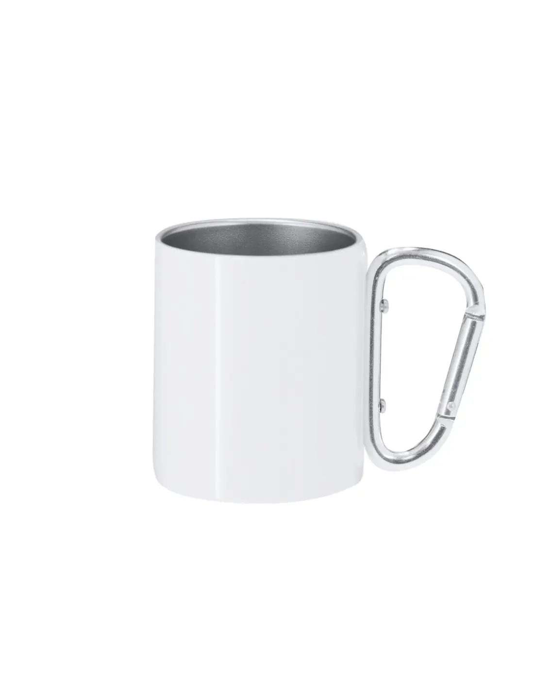 Taza de acero inox de 220ml, con cuerpo de acabado blanco brillante metálico y una funcional asa en forma de mosquetón pudiendo ser fácil de transportar. Especialmente diseñada para la sublimación.