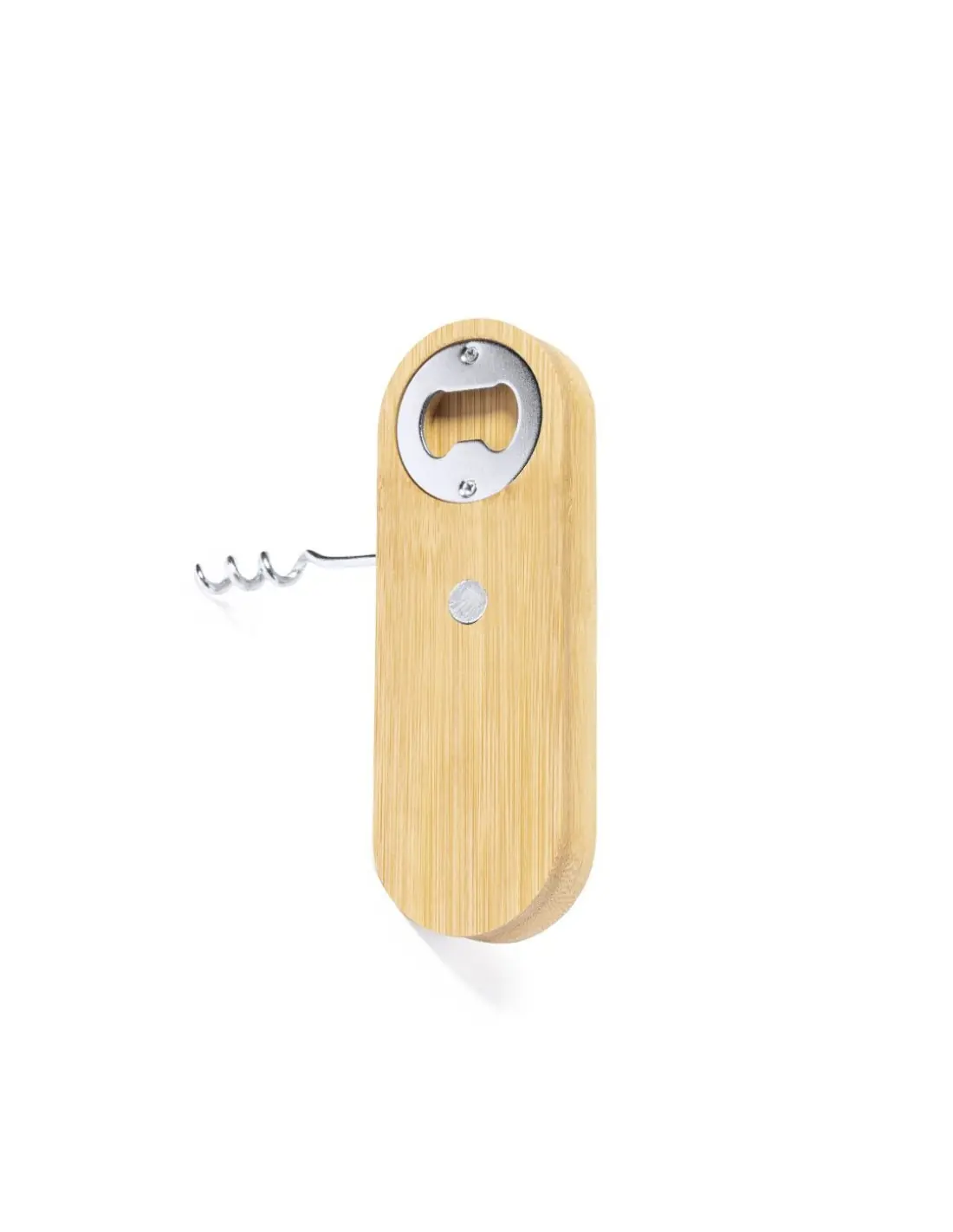 Original sacacorchos abridor magnético de línea nature, fabricado en resistente bambú. Con sacacorchos integrado en cuerpo y sistema de apertura metálico.