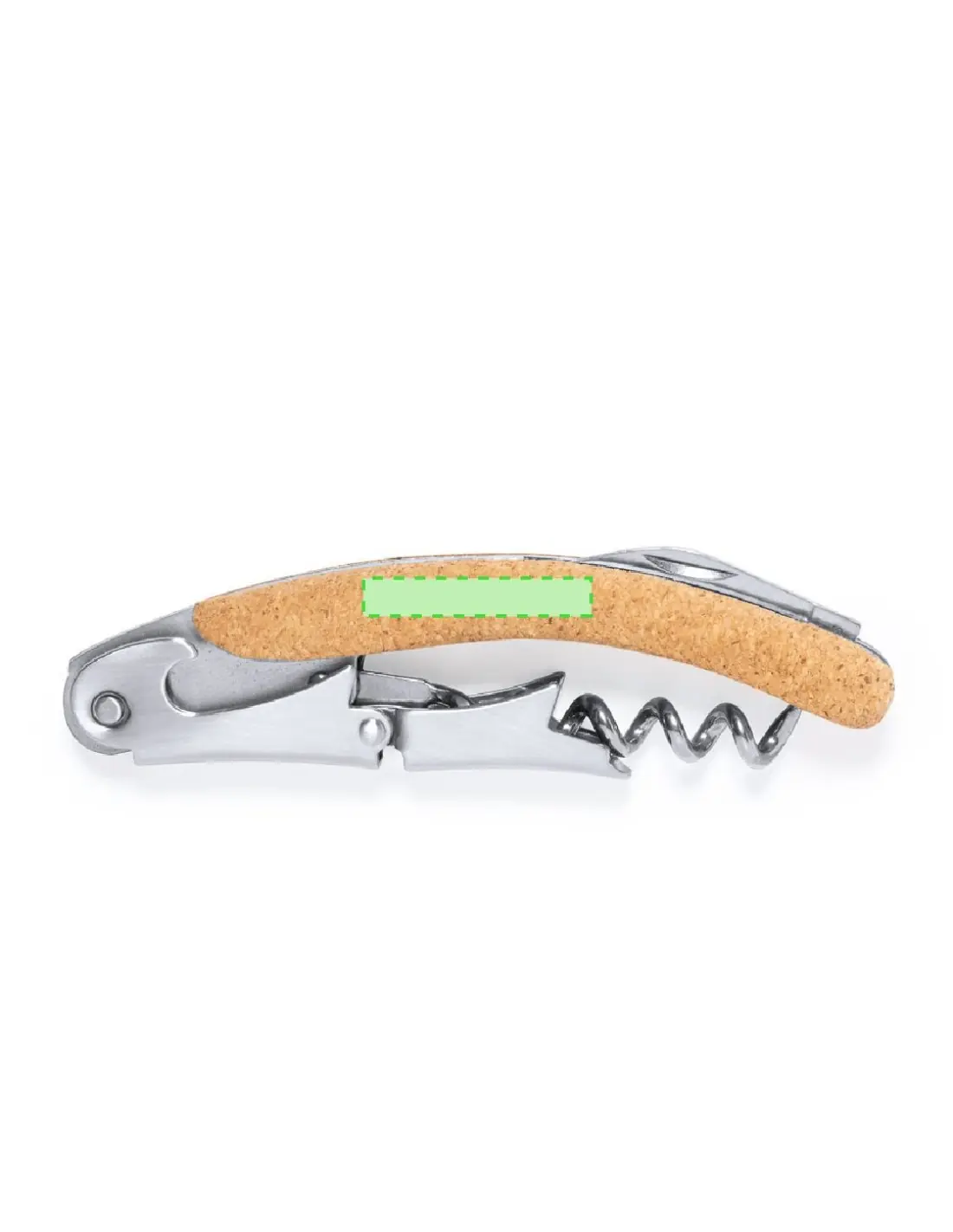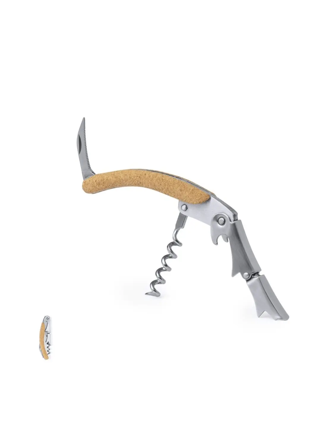 Sacacorchos de 2 tiempos fabricado en acero inox, con mango en corcho natural y cortacápsulas integrado. Presentado en caja individual de diseño kraft.
