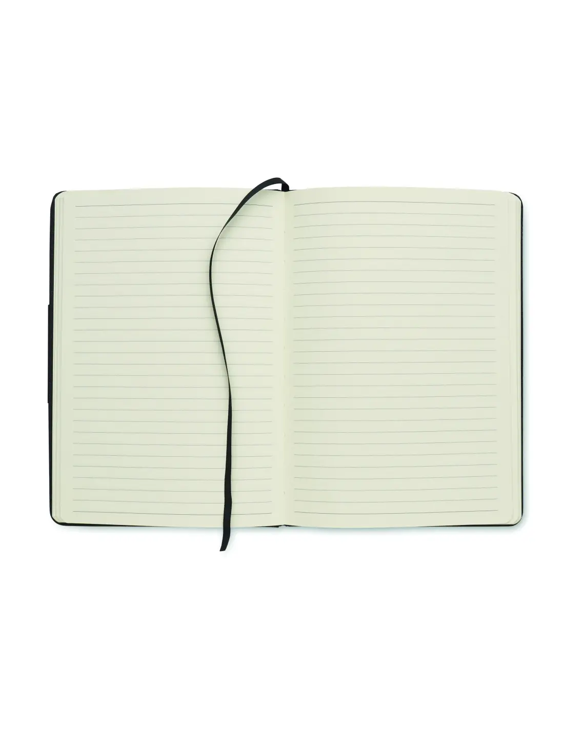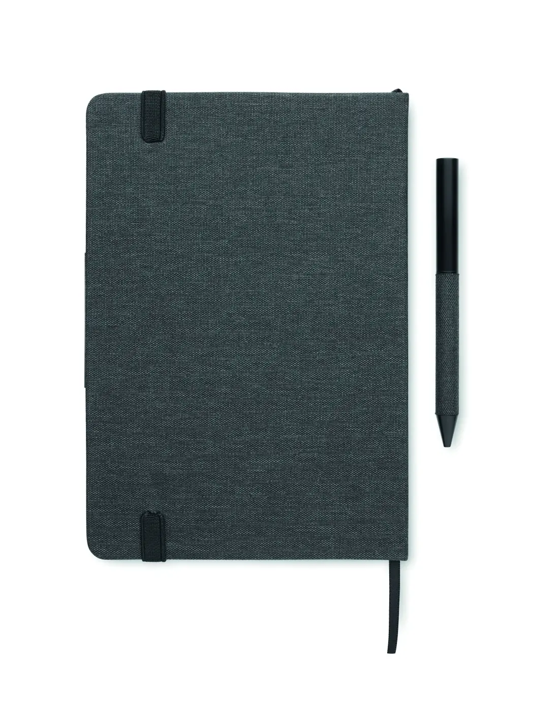Set de regalo de 3 piezas. Incluye libreta A5 con tapa dura de RPET de 160 páginas de papel reciclado rayado (80 hojas). Banda elástica a juego, ma…