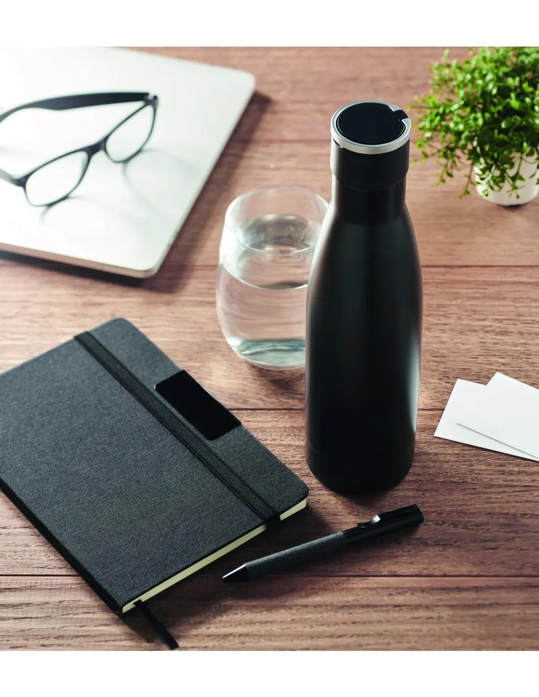 Set de regalo de 3 piezas. Incluye libreta A5 con tapa dura de RPET de 160 páginas de papel reciclado rayado (80 hojas). Banda elástica a juego, marcapáginas y portabolígrafos. Bolígrafo giratorio a juego. Botella de doble pared de acero 500 ml inoxidable con aislamiento al vacío. Presentado en caja de regalo. FSC®-certified | FSC MIX CREDIT, P7.1, FSC-C213206