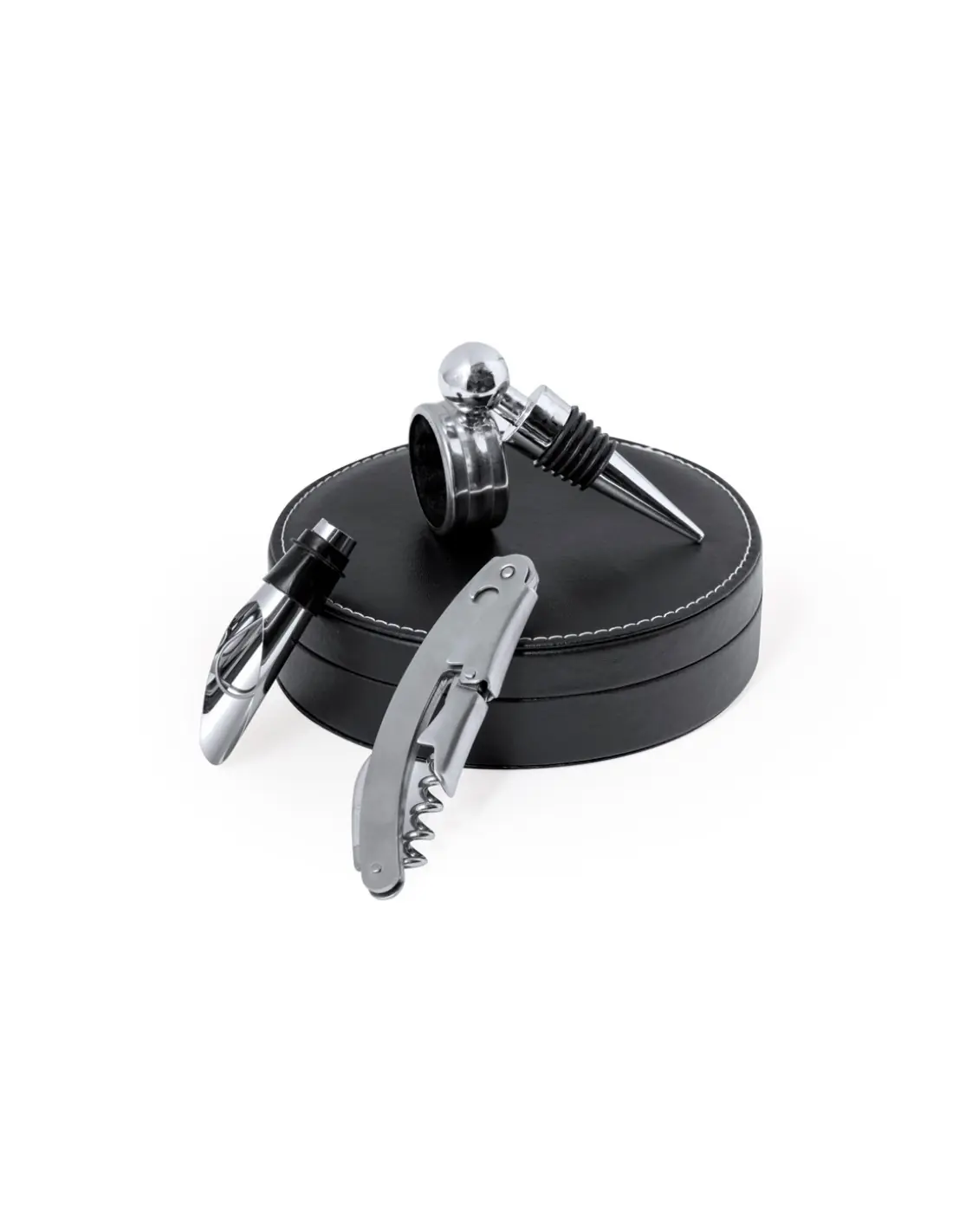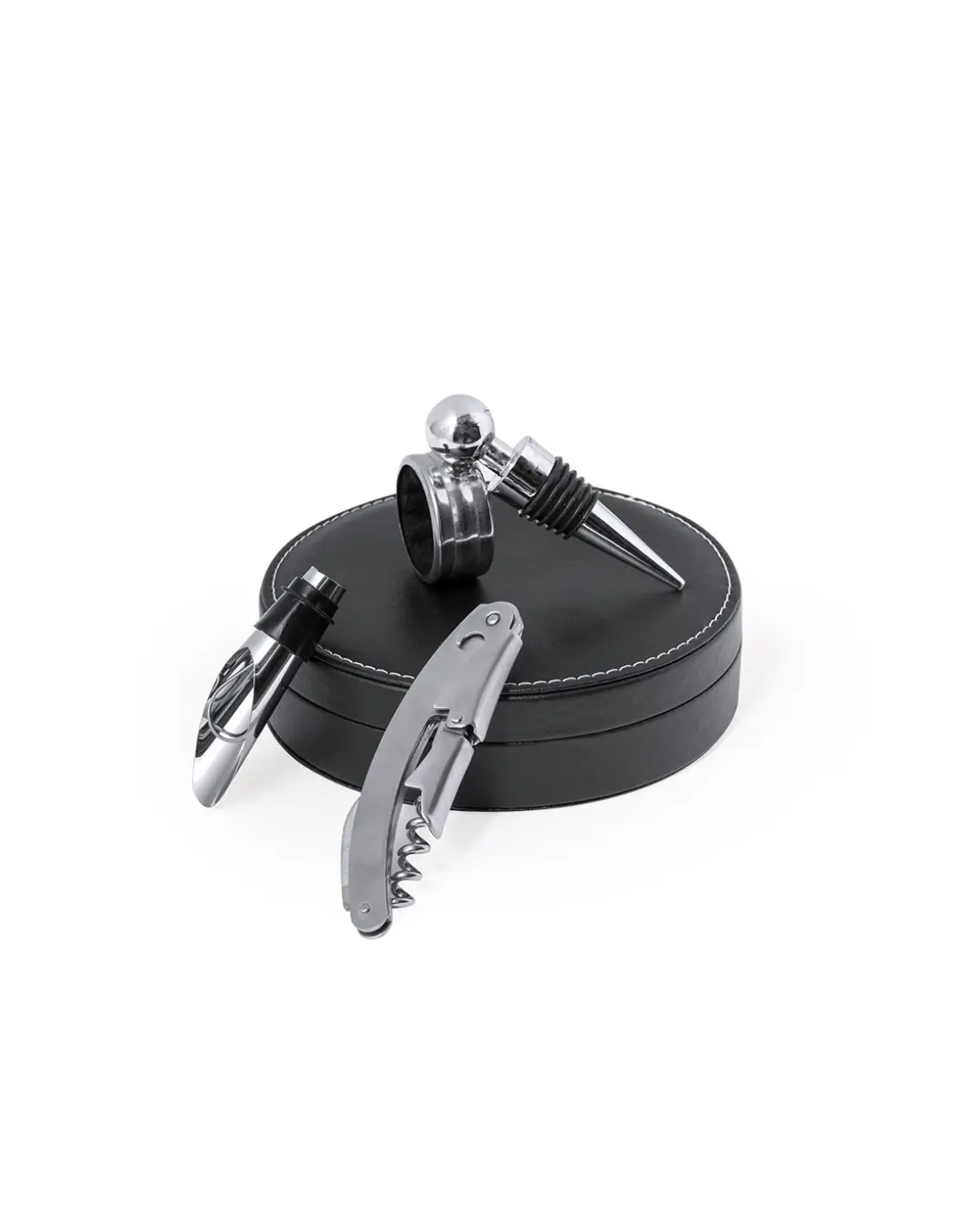 Set de vinos de elegante diseño circular acabado en polipiel, con accesorios de acero inox. Incluye sacacorchos de 2 tiempos con cortacápsulas y abridor; tapón, dosificador y recogegotas. Presentado en estuche individual de polipiel con interior en suave espuma troquelada de color negro.