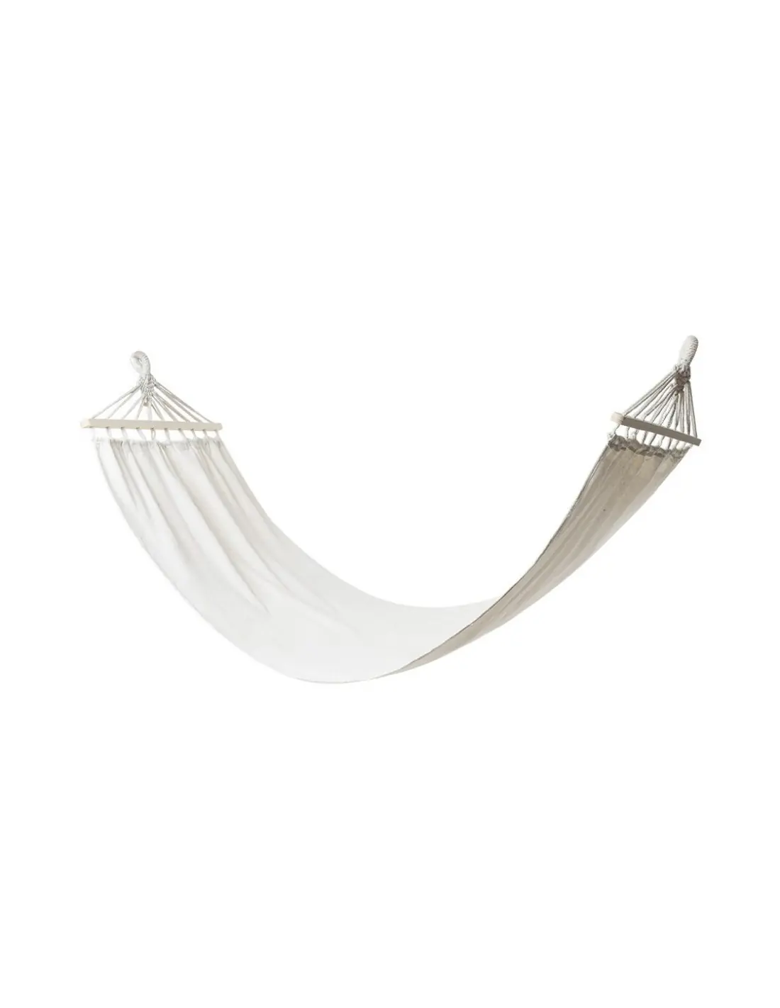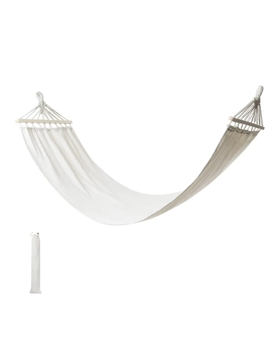 Hamaca fabricada en resistente canvas de 320g/m2 y 190x80cm. Con resistentes cintas de amarre y soportes en madera natural. Soporta hasta 120kg. Presentada en funda de canvas a juego.