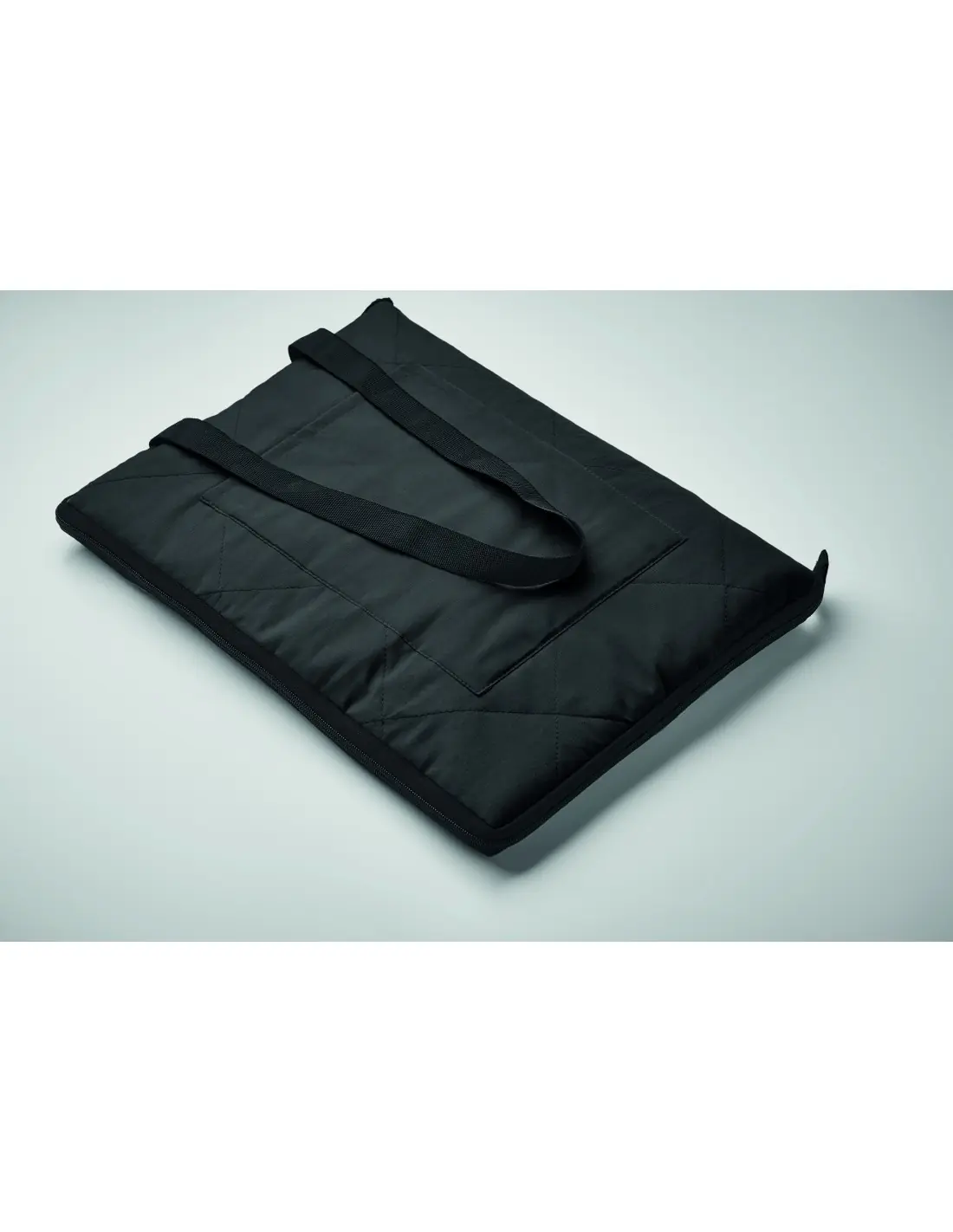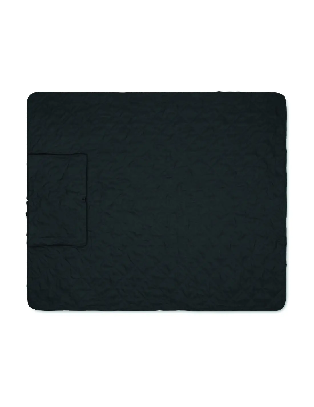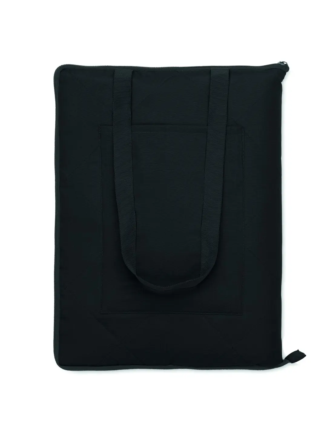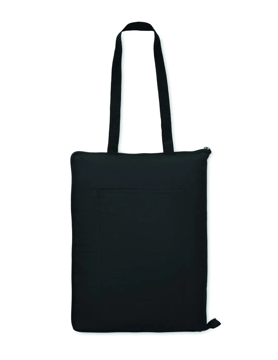 Manta de picnic acolchada y plegable con revestimiento de plástico PEVA en el reverso. Se pliega en una práctica bolsa de asas y tiene una correa ajustable para el hombro. Incluye un gran bolsillo lateral delantero.