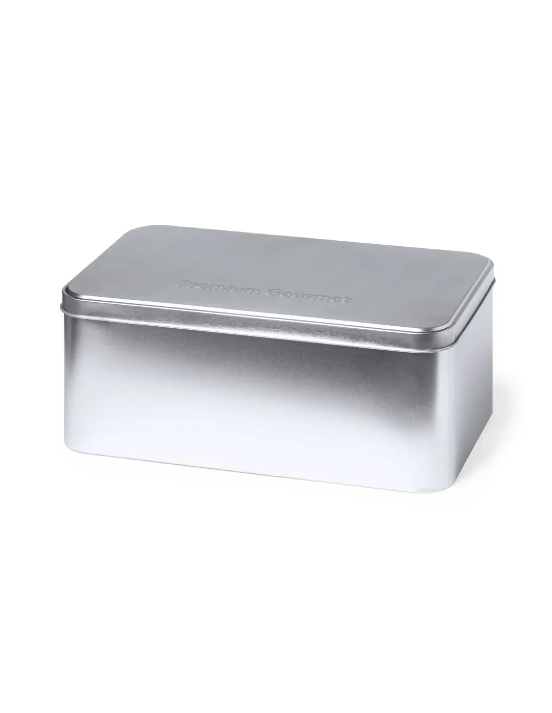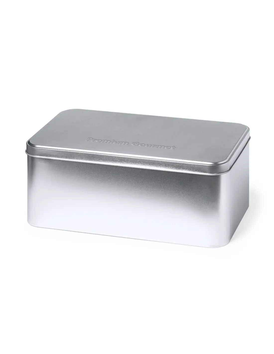 Caja de presentación formato rectangular, fabricada en resistente metal de acabado plateado y con tapa a juego.