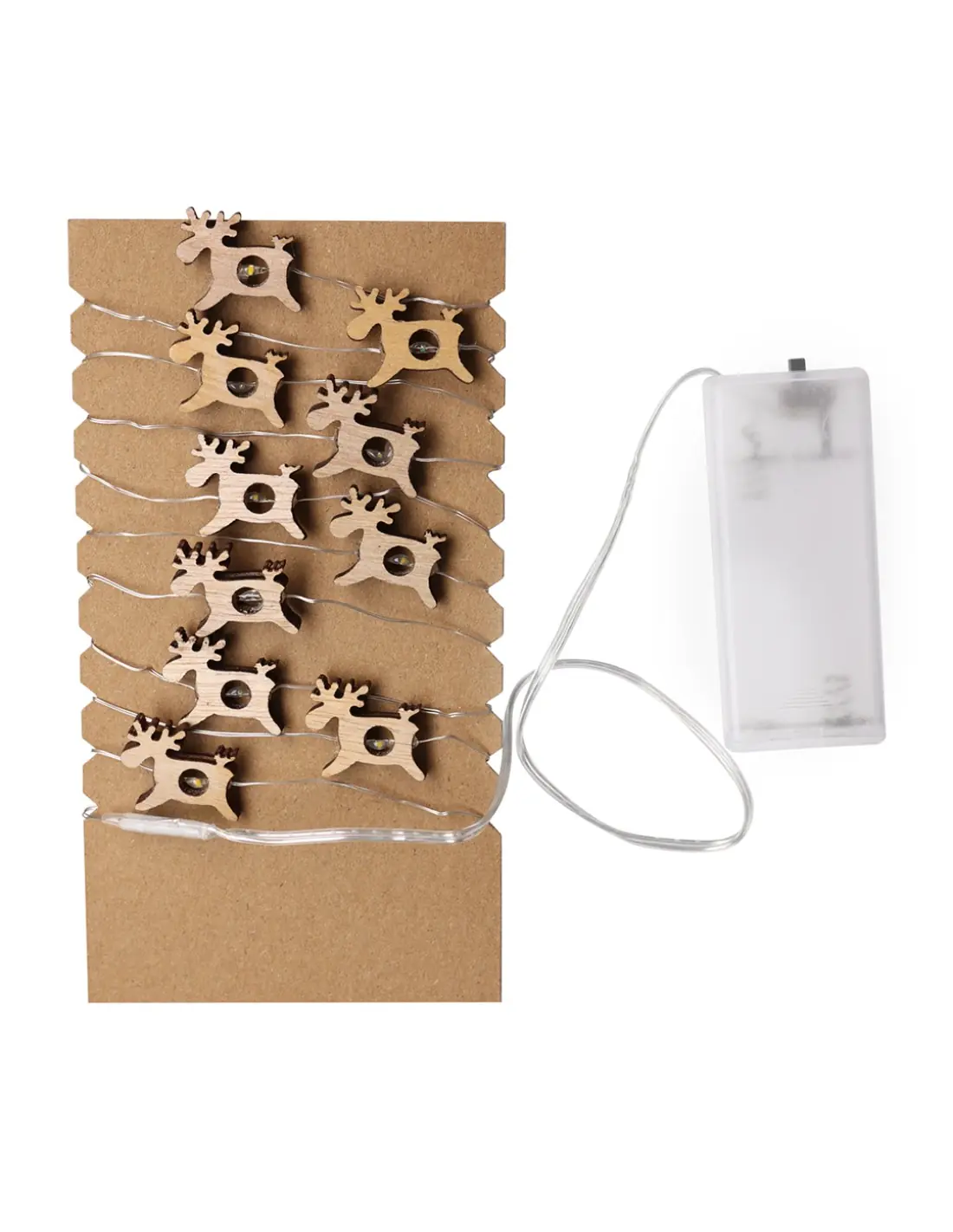Guirnalda iluminada fabricada en madera natural. Con formas de estrella y reno intercaladas, se convierte en un original complemento decorativo que incluye adornos en materiales naturales. Con cálida iluminación con 20 LEDs. Alimentación a pilas (2xAA no incluidas). Presentación en atractiva caja kraft con troquelado en forma de estrella.Elaborado con elementos vegetales para así fomentar la utilización de materias primas naturales y reducir las emisiones contaminantes.