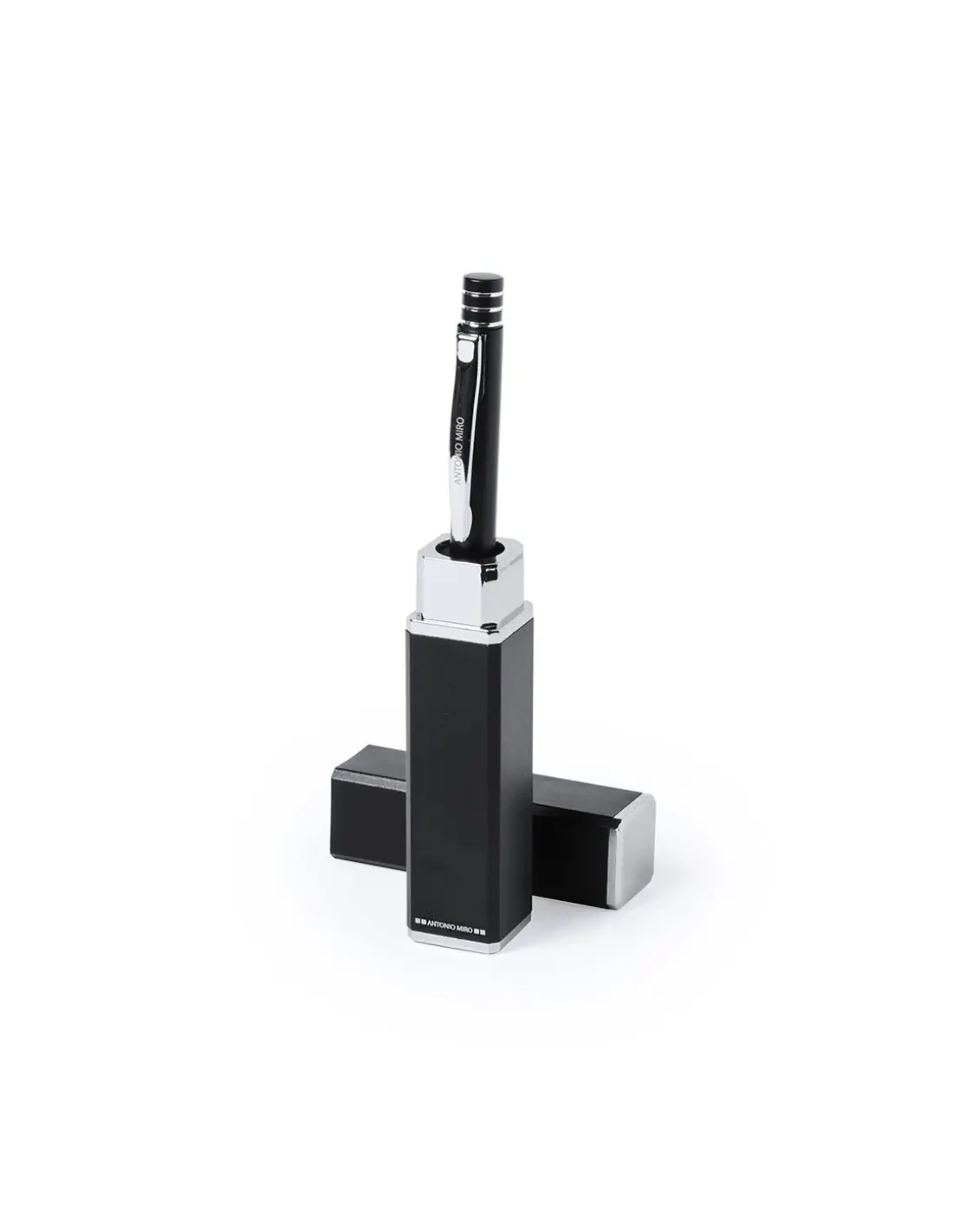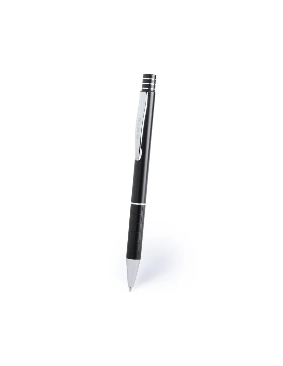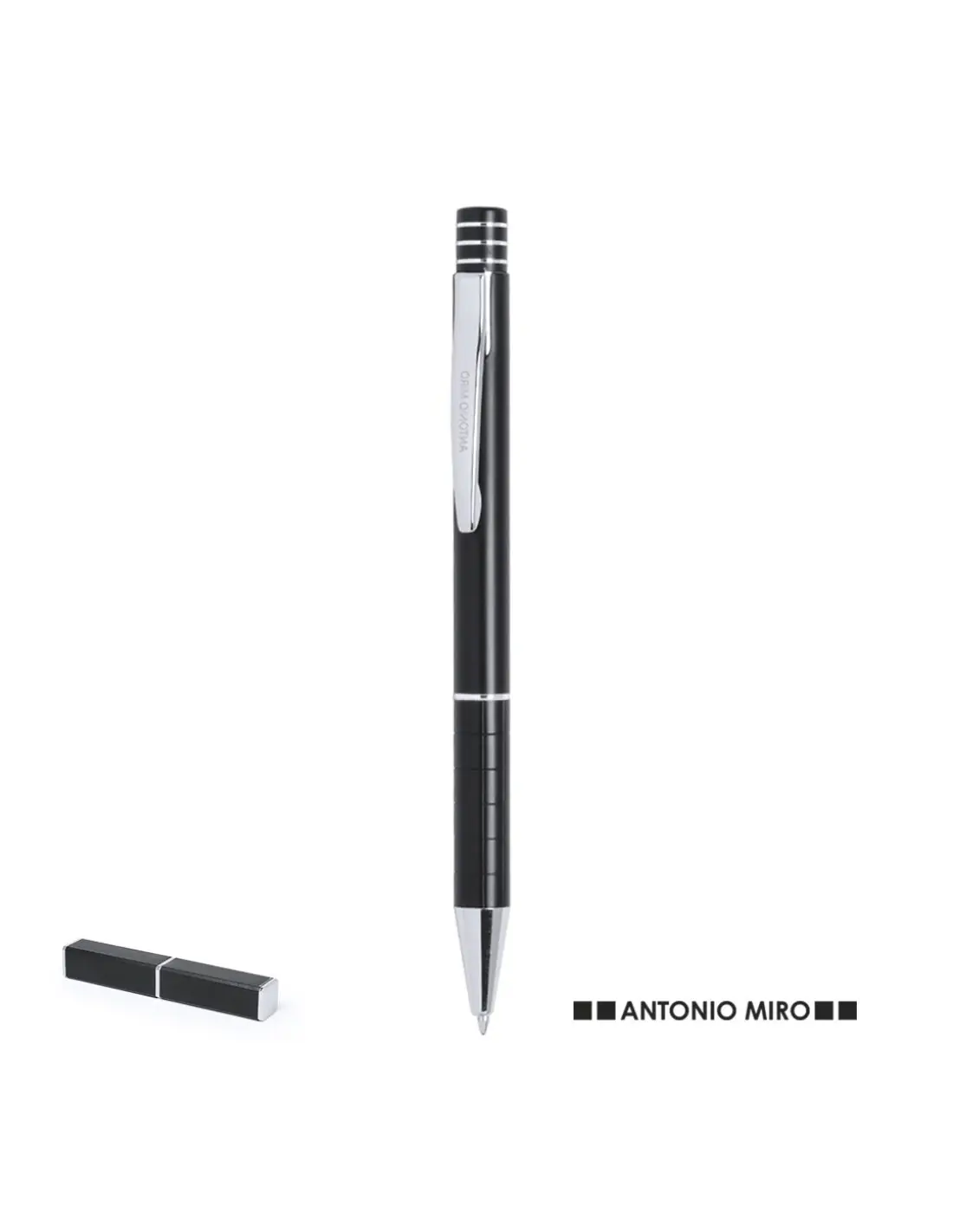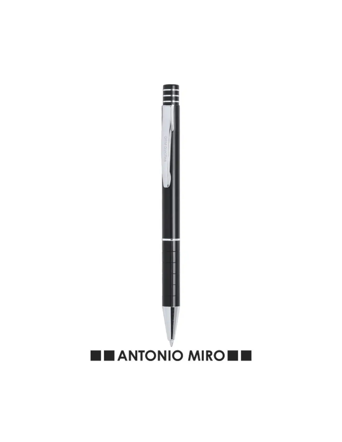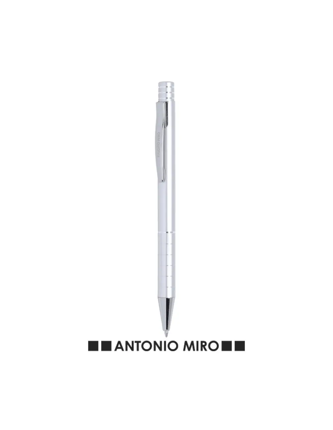 Bolígrafo de Antonio Miró de elegante diseño y suave cuerpo en aluminio con accesorios en color plateado. De mecanismo pulsador, con parte superior anillada, original clip metálico y presentado en estuche individual de aluminio negro con logotipo de la marca. Tinta azul.