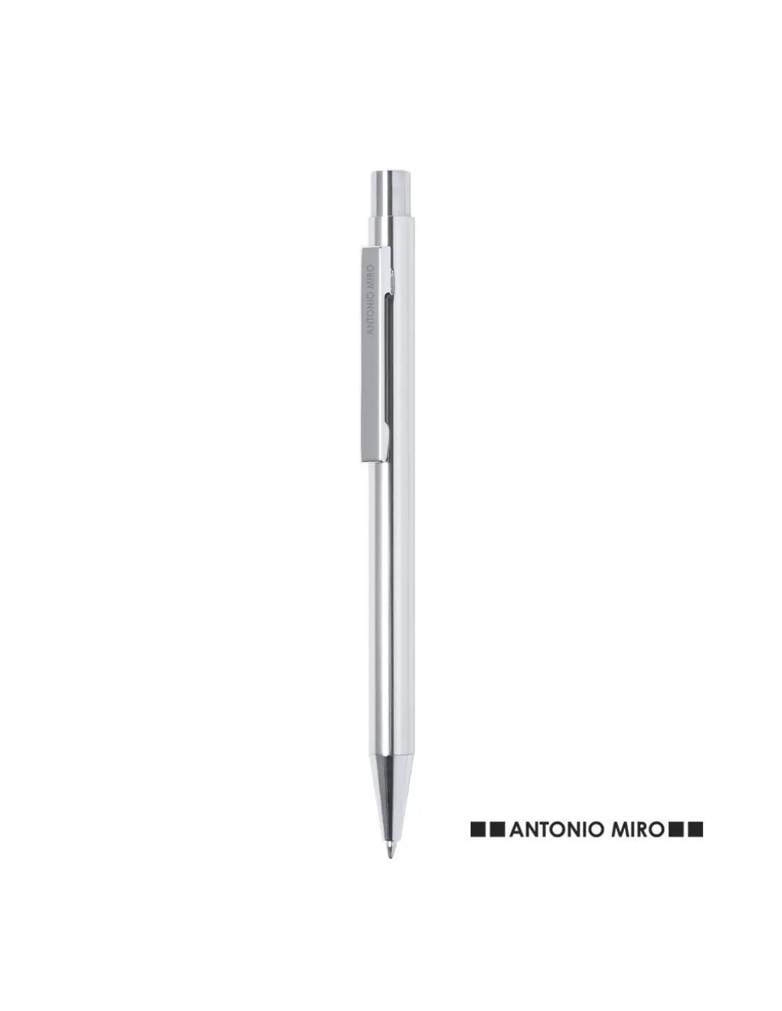 Bolígrafo de Antonio Miró con cuerpo en aluminio de variada gama de vivos colores y en color plateado. De mecanismo pulsador y presentado en bolsita don logotipo de la marca. Tinta azul.