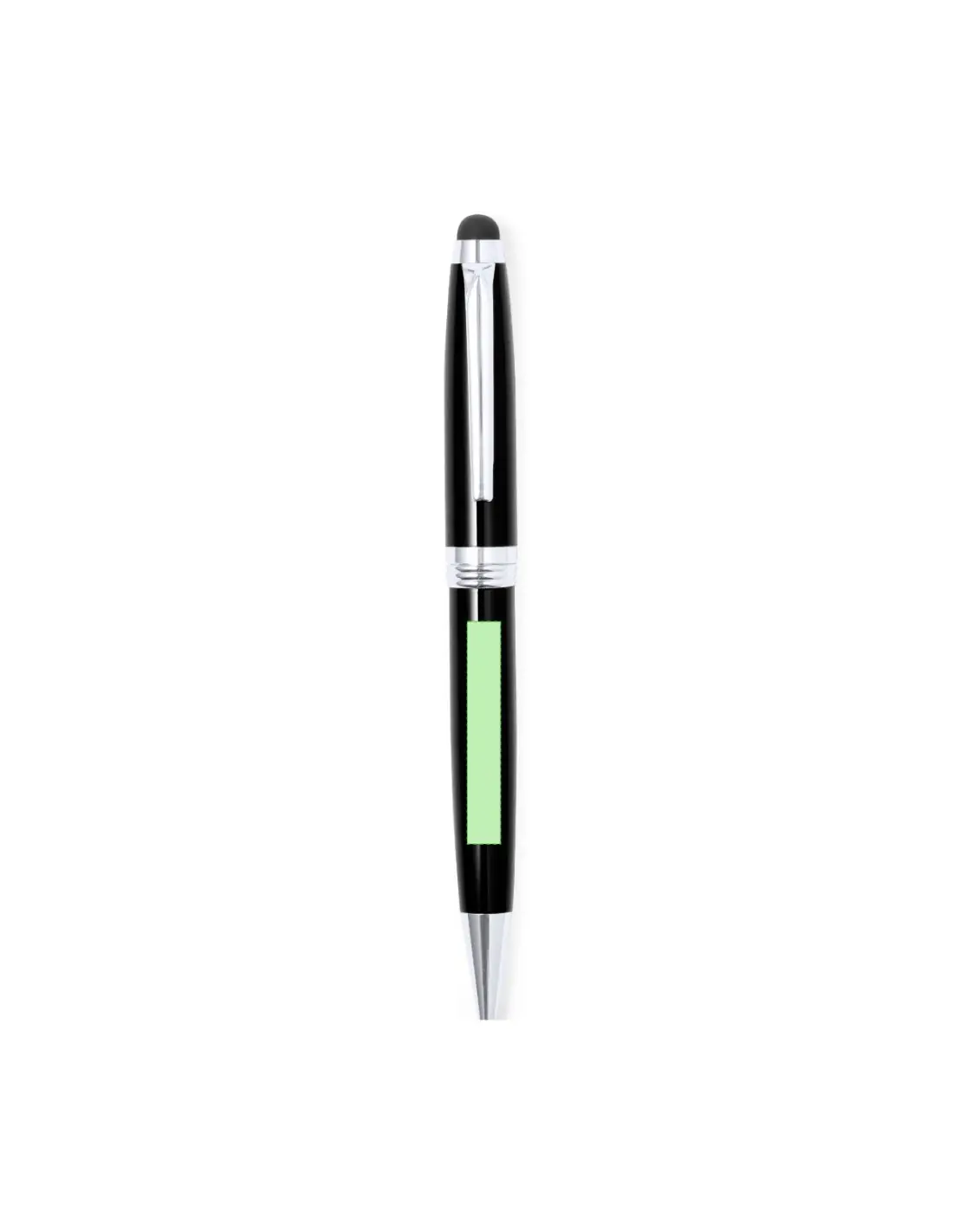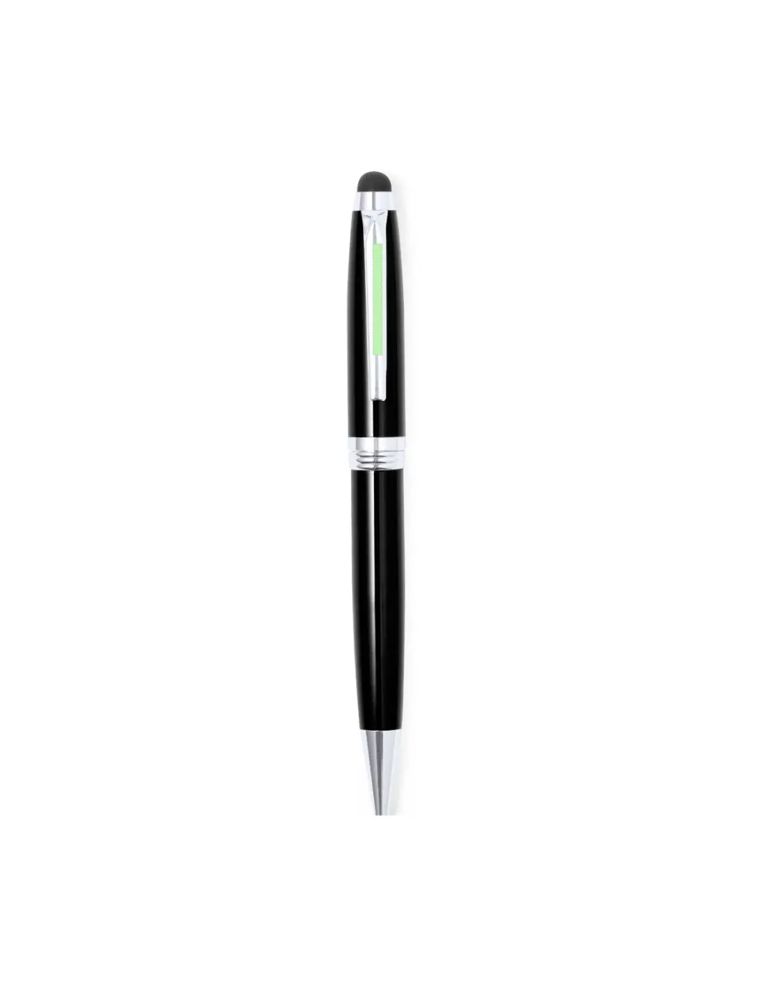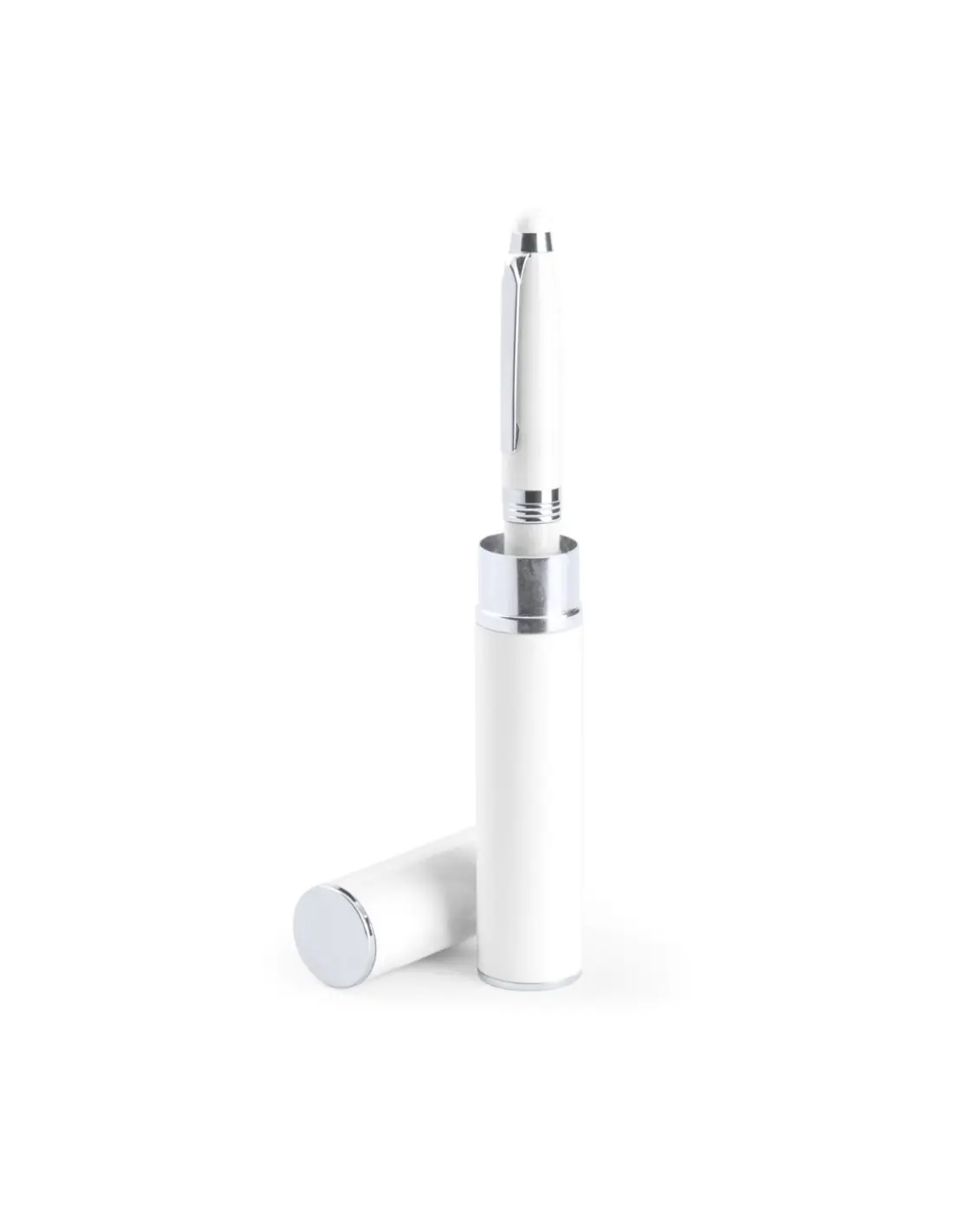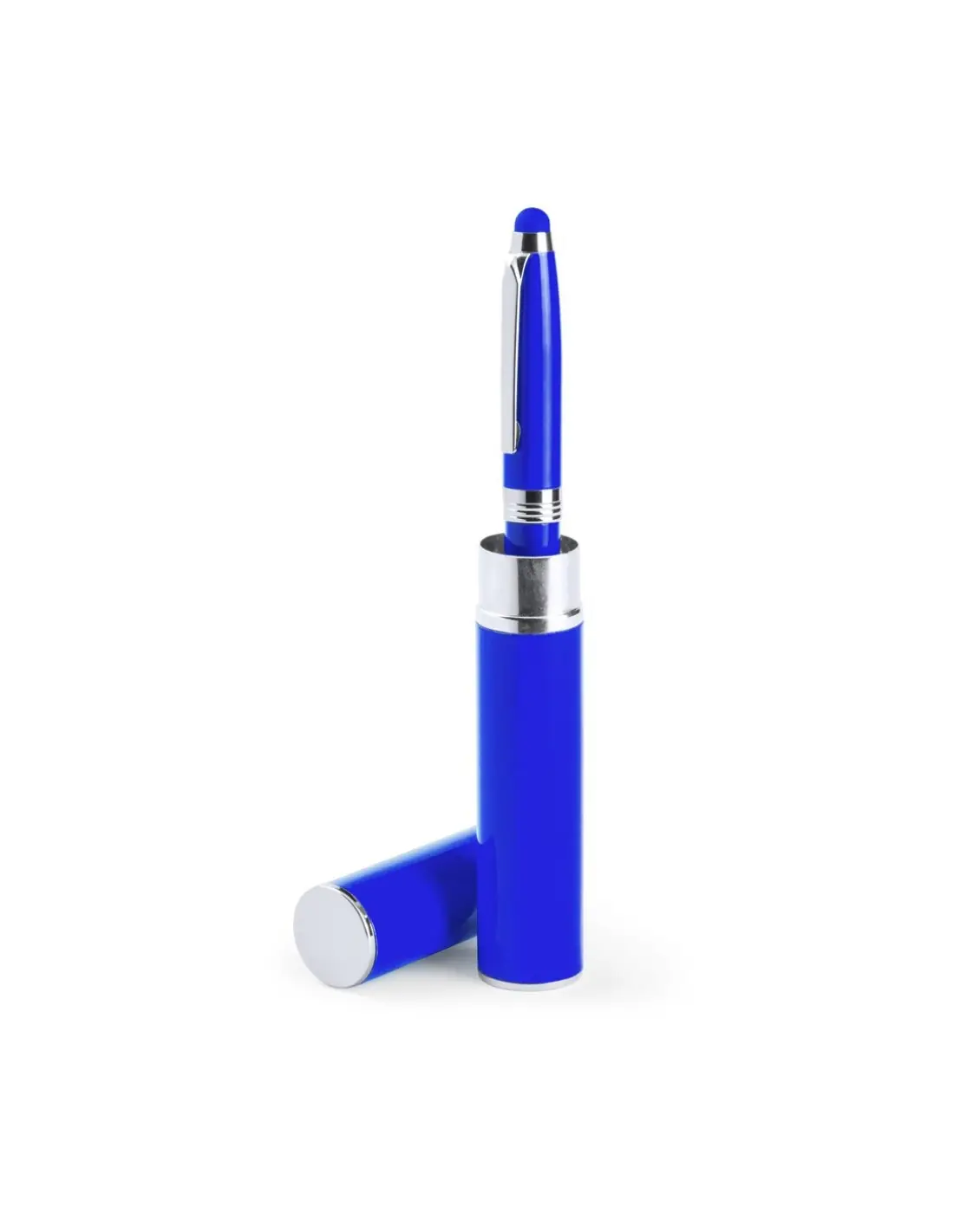 Bolígrafo puntero de mecanismo giratorio con cuerpo metálico de suave acabado en alegres colores. Accesorios y anillas en color plateado. Con puntero a juego y presentado en original estuche metálico a juego. De cartucho jumbo y tinta azul.